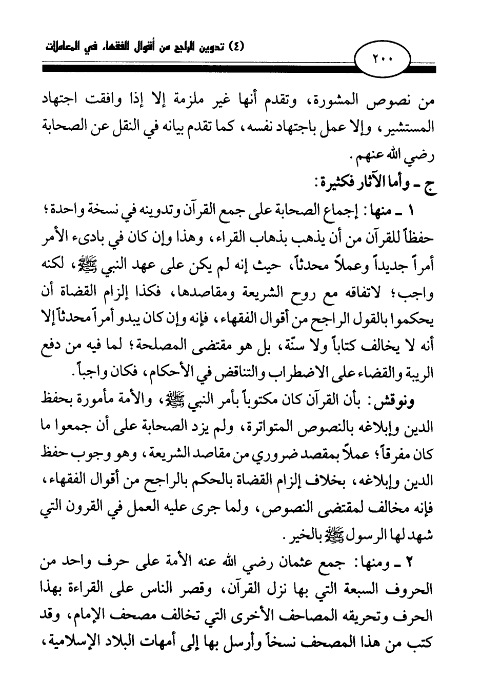 ونوقش: بأن القرآن كان مكتوبا بأمر النبي صلى الله عليه وسلم، والأمة مأمورة بحفظ الدين وإبلاغه بالنصوص المتواترة، ولم يزد الصحابة على أن جمعوا ما كان مفرقا؛ عملا بمقصد ضروري من مقاصد الشريعة، وهو وجوب حفظ الدين وإبلاغه، بخلاف إلزام القضاة بالحكم بالراجح من أقوال الفقهاء، فإنه مخالف لمقتضى النصوص، ولما جرى عليه العمل في القرون التي شهد لها الرسول صلى الله عليه وسلم بالخير.