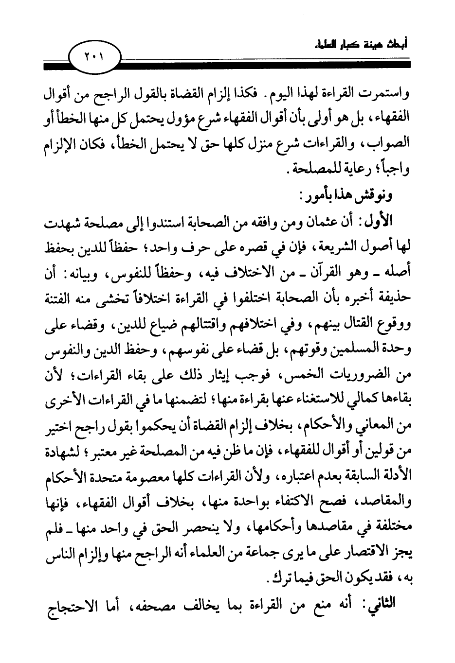 الأول: أن عثمان ومن وافقه من الصحابة استندوا إلى مصلحة شهدت لها أصول الشريعة، فإن في قصره على حرف واحد، حفظا للدين بحفظ أصله- وهو القرآن- من الاختلاف فيه، وحفظا للنفوس، وبيانه: أن حذيفة أخبره بأن الصحابة اختلفوا في القراءة اختلافا تخشى منه الفتنة ووقوع القتال بينهم، وفي اختلافهم واقتتالهم ضياع للدين، وقضاء على وحدة المسلمين وقوتهم، بل قضاء على نفوسهم، وحفظ الدين والنفوس من الضروريات الخمس، فوجب إيثار ذلك على بقاء القراءات؛ لأن بقاءها كمالي للاستغناء عنها بقراءة منها؛ لتضمنها ما في القراءات الأخرى من المعاني والأحكام، بخلاف إلزام القضاة أن يحكموا بقول راجح اختير من قولين أو أقوال للفقهاء، فإن ما ظن فيه من المصلحة غير معتبر؛ لشهادة الأدلة السابقة بعدم اعتباره، ولأن القراءات كلها معصومة متحدة الأحكام والمقاصد، فصح الاكتفاء بواحدة منها، بخلاف أقوال الفقهاء، فإنها مختلفة في مقاصدها وأحكامها، ولا ينحصر الحق في واحد منها - فلم يجز الاقتصار على ما يرى جماعة من العلماء أنه الراجح منها وإلزام الناس به، فقد يكون الحق فيما ترك.