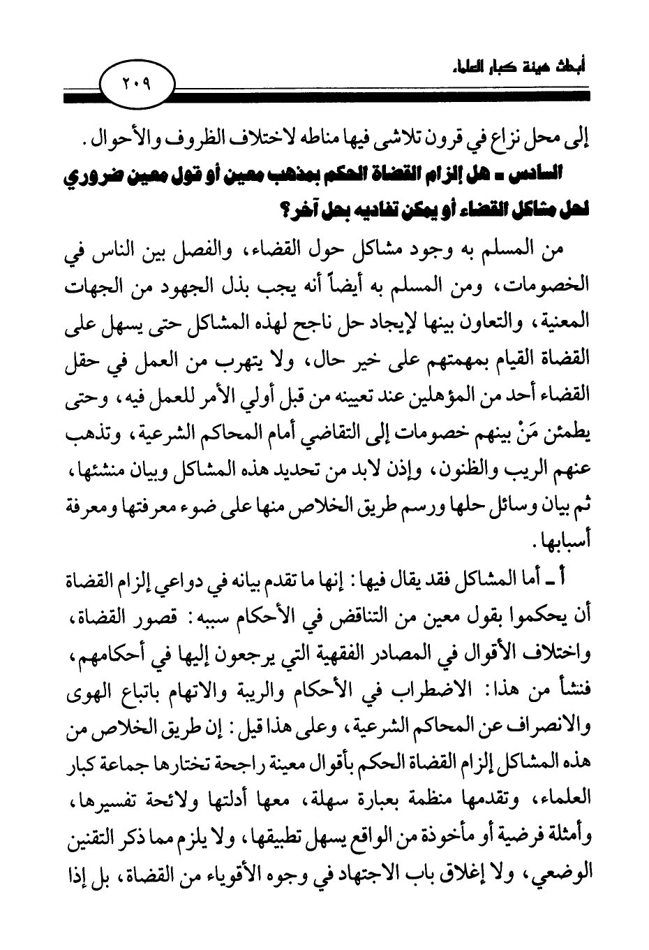 السادس - هل إلزام القضاة الحكم بمذهب معين أو قول معين ضروري لحل مشاكل القضاء أو يمكن تفاديه بحل آخر؟ من المسلم به وجود مشاكل حول القضاء، والفصل بين الناس في الخصومات، ومن المسلم به أيضا أنه يجب بذل الجهود من الجهات المعنية، والتعاون بينها لإيجاد حل ناجح لهذه المشاكل حتى يسهل على القضاة القيام بمهمتهم على خير حال، ولا يتهرب من العمل في حقل القضاء أحد من المؤهلين عند تعيينه من قبل أولي الأمر للعمل فيه، وحتى يطمئن من بينهم خصومات إلى التقاضي أمام المحاكم الشرعية، وتذهب عنهم الريب والظنون، وإذن لا بد من تحديد هذه المشاكل وبيان منشئها، ثم بيان وسائل حلها ورسم طريق الخلاص منها على ضوء معرفتها ومعرفة أسبابها.