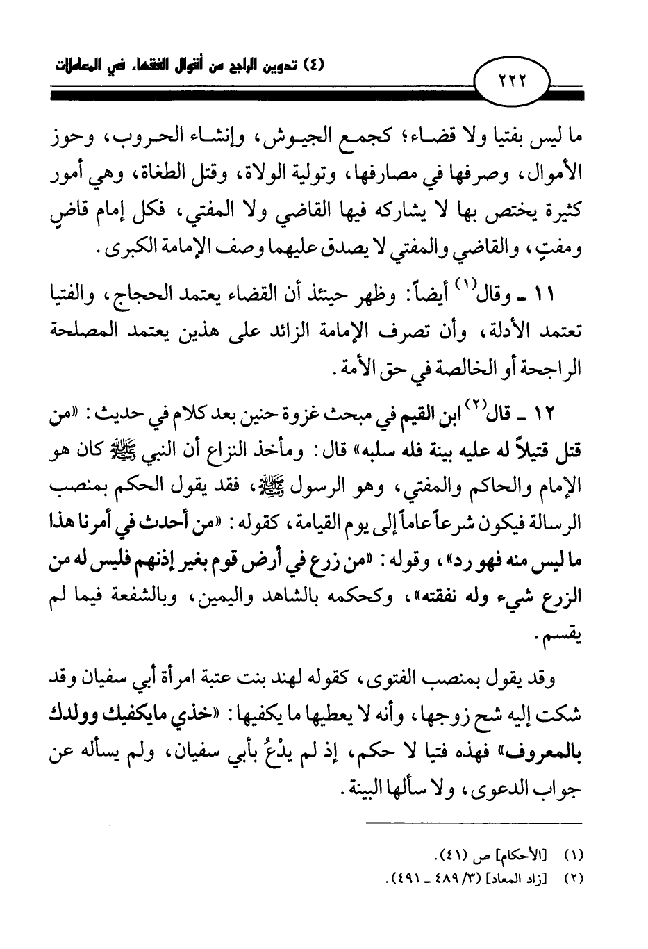 12 - قال (¬2) ابن القيم في مبحث غزوة حنين بعد كلام في حديث: «من قتل قتيلا له عليه بينة فله سلبه (¬3) » قال: ومأخذ النزاع أن النبي صلى الله عليه وسلم كان هو الإمام والحاكم والمفتي، وهو الرسول صلى الله عليه وسلم، فقد يقول الحكم بمنصب الرسالة فيكون شرعا عاما إلى يوم القيامة، كقوله: «من أحدث في أمرنا هذا ما ليس منه فهو رد (¬4) » ، وقوله: «من زرع في أرض قوم بغير إذنهم فليس له من الزرع شيء وله نفقته (¬5) » ، وكحكمه بالشاهد واليمين، وبالشفعة فيما لم يقسم.