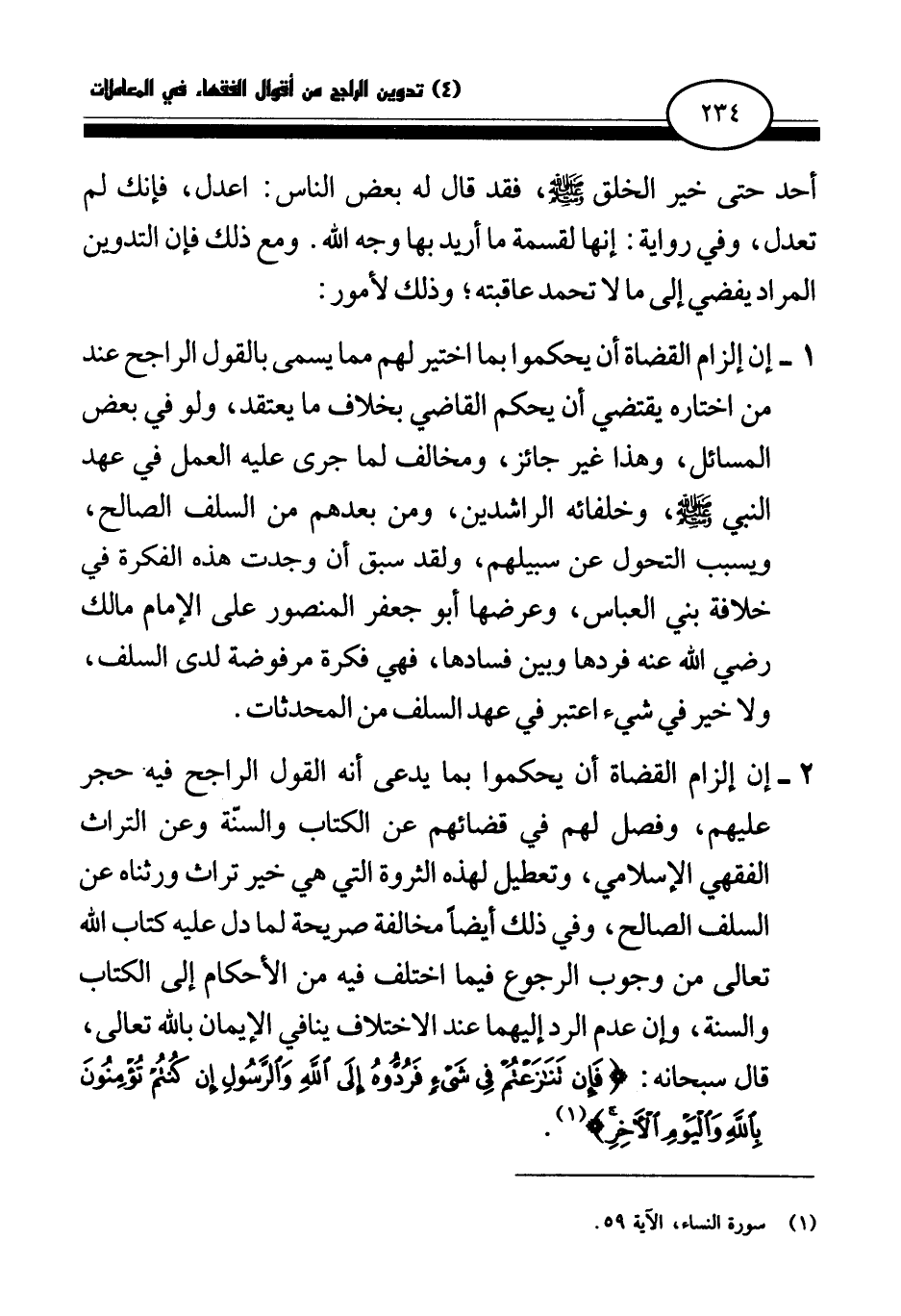 2 - إن إلزام القضاة أن يحكموا بما يدعى أنه القول الراجح فيه حجر عليهم، وفصل لهم في قضائهم عن الكتاب والسنة وعن التراث الفقهي الإسلامي، وتعطيل لهذه الثروة التي هي خير تراث ورثناه عن السلف الصالح، وفي ذلك أيضا مخالفة صريحة لما دل عليه كتاب الله تعالى من وجوب الرجوع فيما اختلف فيه من الأحكام إلى الكتاب والسنة، وإن عدم الرد إليهما عند الاختلاف ينافي الإيمان بالله تعالى، قال سبحانه: {فَإِنْ تَنَازَعْتُمْ فِي شَيْءٍ فَرُدُّوهُ إِلَى اللَّهِ وَالرَّسُولِ إِنْ كُنْتُمْ تُؤْمِنُونَ بِاللَّهِ وَالْيَوْمِ الْآخِرِ} (¬1)