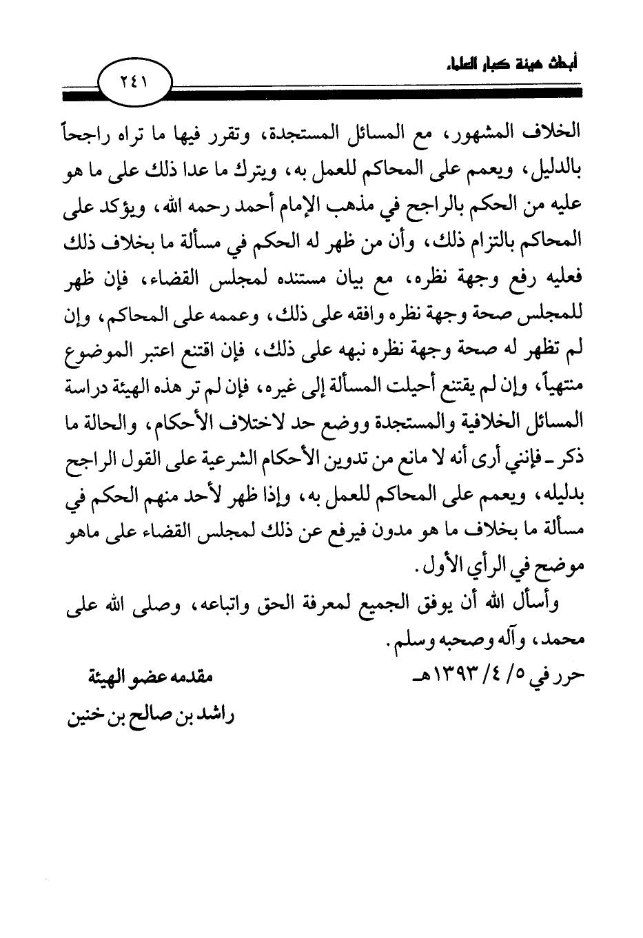 الخلاف المشهور، مع المسائل المستجدة، وتقرر فيها ما تراه راجحا بالدليل، ويعمم على المحاكم للعمل به، ويترك ما عدا ذلك على ما هو عليه من الحكم بالراجح في مذهب الإمام أحمد رحمه الله، ويؤكد على المحاكم بالتزام ذلك، وأن من ظهر له الحكم في مسألة ما بخلاف ذلك فعليه رفع وجهة نظره، مع بيان مستنده لمجلس القضاء، فإن ظهر للمجلس صحة وجهة نظره وافقه على ذلك، وعممه على المحاكم، وإن لم تظهر له صحة وجهة نظره نبهه على ذلك، فإن اقتنع اعتبر الموضوع منتهيا، وإن لم يقتنع أحيلت المسألة إلى غيره، فإن لم تر هذه الهيئة دراسة المسائل الخلافية والمستجدة ووضع حد لاختلاف الأحكام، والحالة ما ذكر - فإنني أرى أنه لا مانع من تدوين الأحكام الشرعية على القول الراجح بدليله، ويعمم على المحاكم للعمل به، وإذا ظهر لأحد منهم الحكم في مسألة ما بخلاف ما هو مدون فيرفع عن ذلك لمجلس القضاء على ما هو موضح في الرأي الأول.