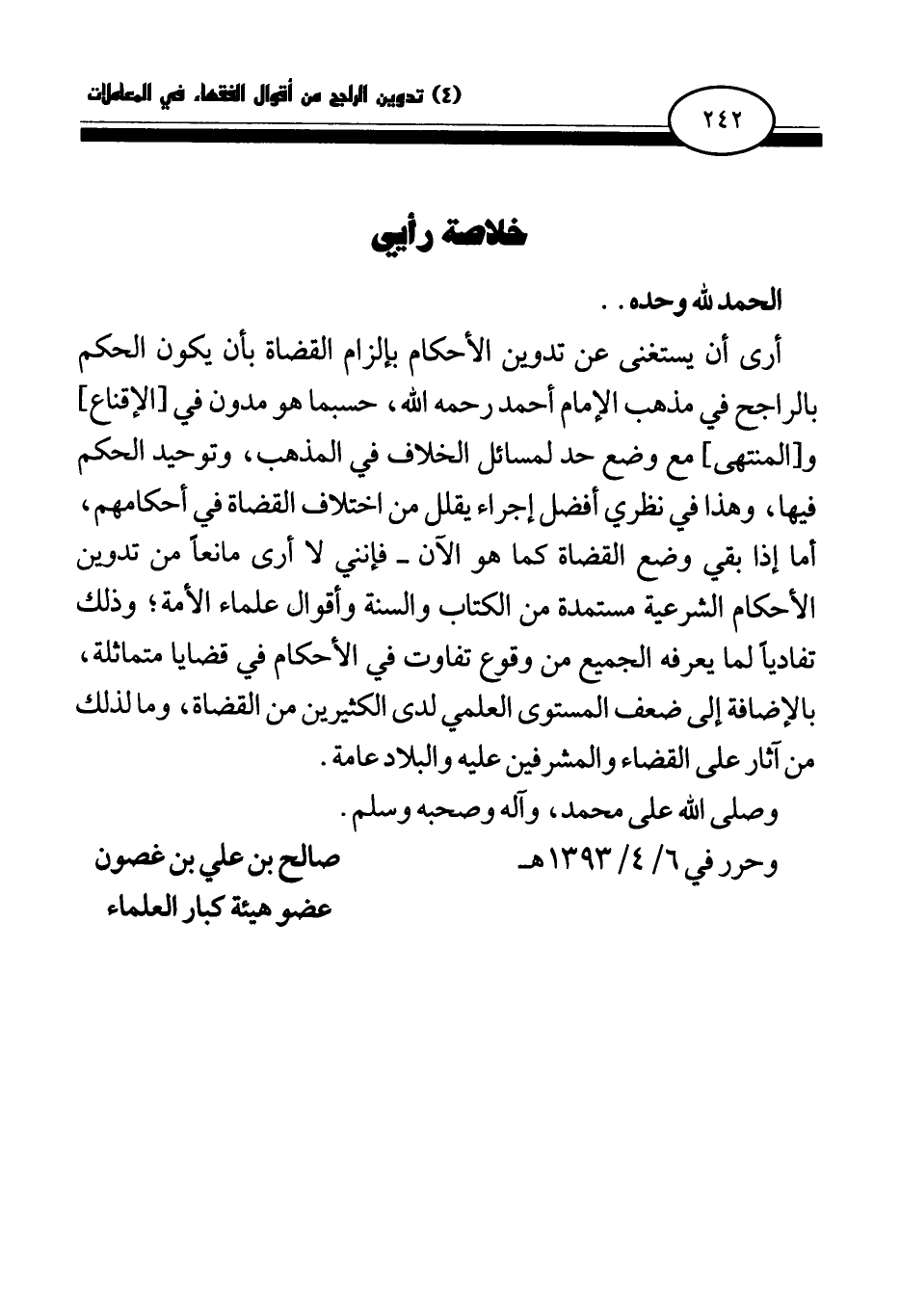 أرى أن يستغنى عن تدوين الأحكام بإلزام القضاة بأن يكون الحكم بالراجح في مذهب الإمام أحمد رحمه الله، حسبما هو مدون في [الإقناع] و [المنتهى] مع وضع حد لمسائل الخلاف في المذهب، وتوحيد الحكم فيها، وهذا في نظري أفضل إجراء يقلل من اختلاف القضاة في أحكامهم، أما إذا بقي وضع القضاة كما هو الآن - فإنني لا أرى مانعا من تدوين الأحكام الشرعية مستمدة من الكتاب والسنة وأقوال علماء الأمة؛ وذلك تفاديا لما يعرفه الجميع من وقوع تفاوت في الأحكام في قضايا متماثلة، بالإضافة إلى ضعف المستوى العلمي لدى الكثيرين من القضاة، وما لذلك من آثار على القضاء والمشرفين عليه والبلاد عامة.