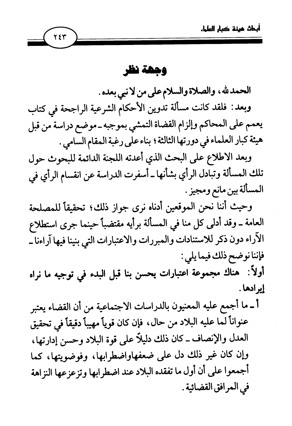 وبعد: فلقد كانت مسألة تدوين الأحكام الشرعية الراجحة في كتاب يعمم على المحاكم وإلزام القضاة التمشي بموجبه - موضع دراسة من قبل هيئة كبار العلماء في دورتها الثالثة؛ بناء على رغبة المقام السامي.