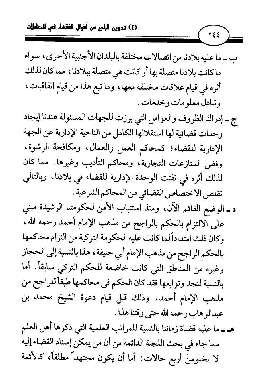 د- الوضع القائم الآن، ومنذ استتباب الأمن لحكومتنا الرشيدة مبني على الالتزام بالحكم الراجح من مذهب الإمام أحمد رحمه الله، وكان ذلك امتدادا لما كانت عليه الحكومة التركية من التزام محاكمها بالحكم الراجح من مذهب الإمام أبي حنيفة، هذا بالنسبة إلى الحجاز وغيره من المناطق التي كانت خاضعة للحكم التركي سابقا. أما بالنسبة لنجد وتوابعها فقد كان الحكم في محاكمها طبقا للراجح من مذهب الإمام أحمد، وذلك قبل قيام دعوة الشيخ محمد بن عبد الوهاب رحمه الله حتى وقتنا هذا.