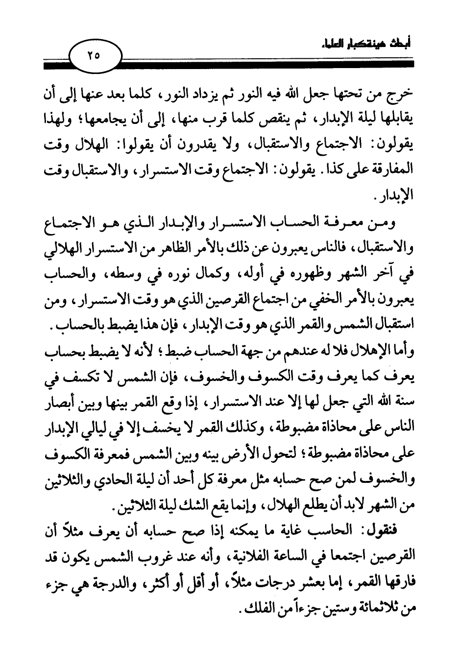 وأما الإهلال فلا له عندهم من جهة الحساب ضبط؛ لأنه لا يضبط بحساب يعرف كما يعرف وقت الكسوف والخسوف، فإن الشمس لا تكسف في سنة الله التي جعل لها إلا عند الاستسرار، إذا وقع القمر بينها وبين أبصار الناس على محاذاة مضبوطة؛ وكذلك القمر لا يخسف إلا في ليالي الإبدار على محاذاة مضبوطة؛ لتحول الأرض بينه وبين الشمس فمعرفة الكسوف والخسوف لمن صح حسابه مثل معرفة كل أحد أن ليلة الحادي والثلاثين من الشهر لا بد أن يطلع الهلال، وإنما يقع الشك ليلة الثلاثين.