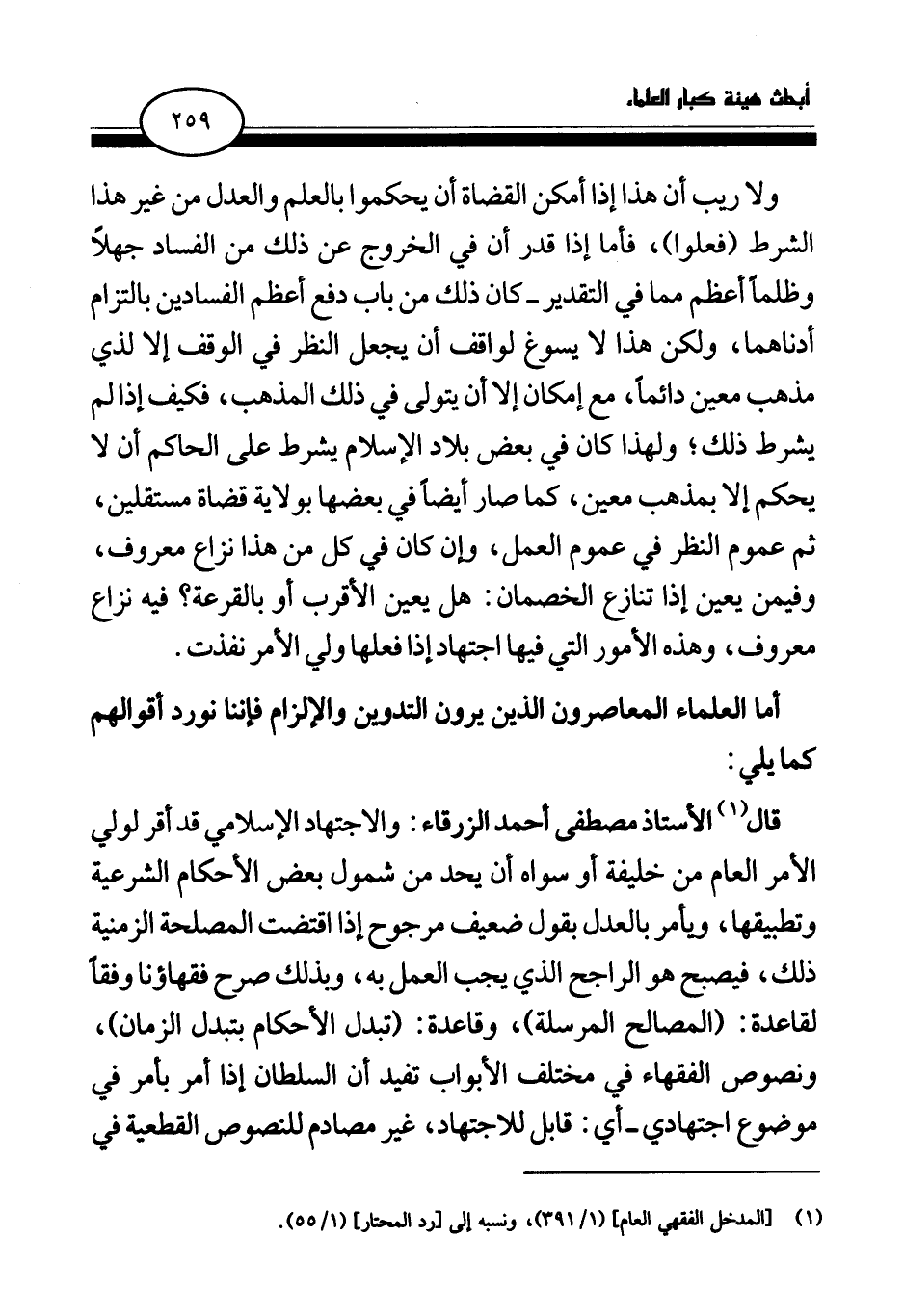 قال (¬1) الأستاذ مصطفى أحمد الزرقاء: والاجتهاد الإسلامي قد أقر لولي الأمر العام من خليفة أو سواه أن يحد من شمول بعض الأحكام الشرعية وتطبيقها، ويأمر بالعدل بقول ضعيف مرجوح إذا اقتضت المصلحة الزمنية ذلك، فيصبح هو الراجح الذي يجب العمل به، وبذلك صرح فقهاؤنا وفقا لقاعدة: (المصالح المرسلة) ، وقاعدة: (تبدل الأحكام بتبدل الزمان) ، ونصوص الفقهاء في مختلف الأبواب تفيد أن السلطان إذا أمر بأمر في موضوع اجتهادي - أي: قابل للاجتهاد، غير مصادم للنصوص القطعية في