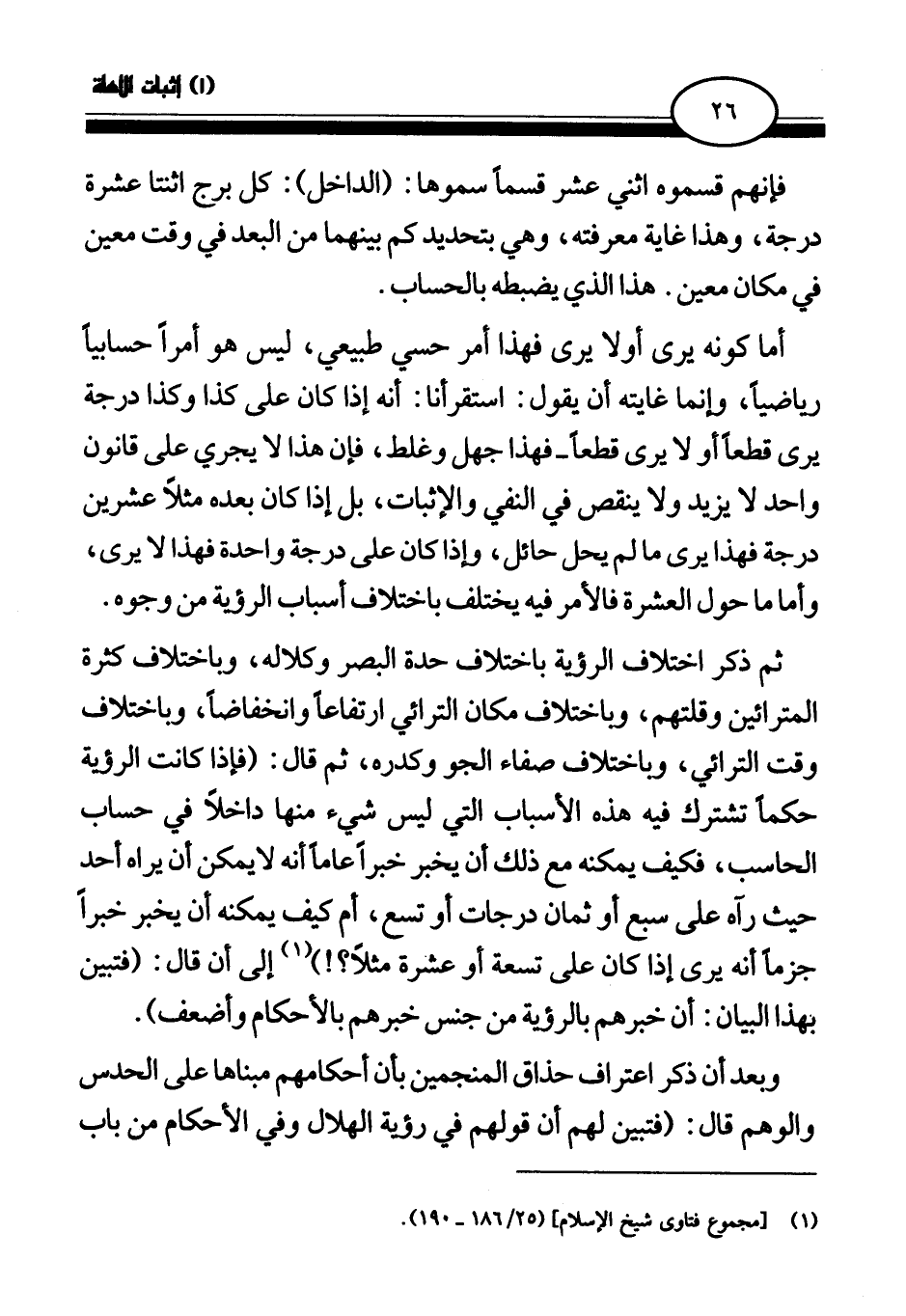 أما كونه يرى أولا يرى فهذا أمر حسي طبيعي، ليس هو أمرا حسابيا رياضيا، وإنما غايته أن يقول: استقرأنا: أنه إذا كان على كذا وكذا درجة يرى قطعا أو لا يرى قطعا - فهذا جهل وغلط، فإن هذا لا يجري على قانون واحد لا يزيد ولا ينقص في النفي والإثبات، بل إذا كان بعده مثلا عشرين درجة فهذا يرى ما لم يحل حائل، وإذا كان على درجة واحدة فهذا لا يرى، وأما ما حول العشرة فالأمر فيه يختلف باختلاف أسباب الرؤية من وجوه.