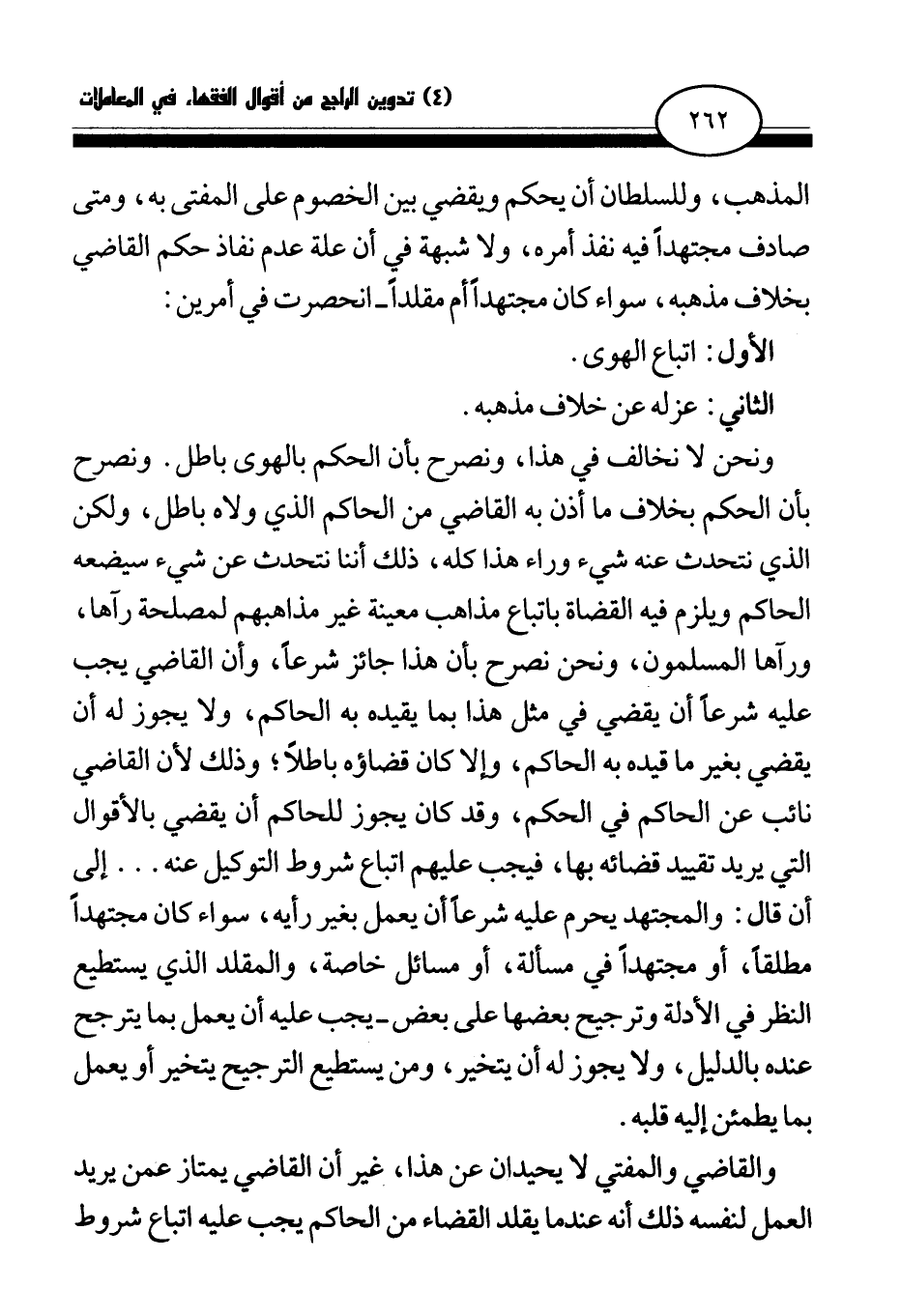 ونحن لا نخالف في هذا، ونصرح بأن الحكم بالهوى باطل. ونصرح بأن الحكم بخلاف ما أذن به القاضي من الحاكم الذي ولاه باطل، ولكن الذي نتحدث عنه شيء وراء هذا كله، ذلك أننا نتحدث عن شيء سيضعه الحاكم ويلزم فيه القضاة باتباع مذاهب معينة غير مذاهبهم لمصلحة رآها، ورآها المسلمون، ونحن نصرح بأن هذا جائز شرعا، وأن القاضي يجب عليه شرعا أن يقضي في مثل هذا بما يقيده به الحاكم، ولا يجوز له أن يقضي بغير ما قيده به الحاكم، وإلا كان قضاؤه باطلا؛ وذلك لأن القاضي نائب عن الحاكم في الحكم، وقد كان يجوز للحاكم أن يقضي بالأقوال التي يريد تقييد قضائه بها، فيجب عليهم اتباع شروط التوكيل عنه. . . إلى أن قال: والمجتهد يحرم عليه شرعا أن يعمل بغير رأيه، سواء كان مجتهدا مطلقا، أو مجتهدا في مسألة، أو مسائل خاصة، والمقلد الذي يستطيع النظر في الأدلة وترجيح بعضها على بعض - يجب عليه أن يعمل بما يترجح عنده بالدليل، ولا يجوز له أن يتخير، ومن يستطيع الترجيح يتخير أو يعمل بما يطمئن إليه قلبه.