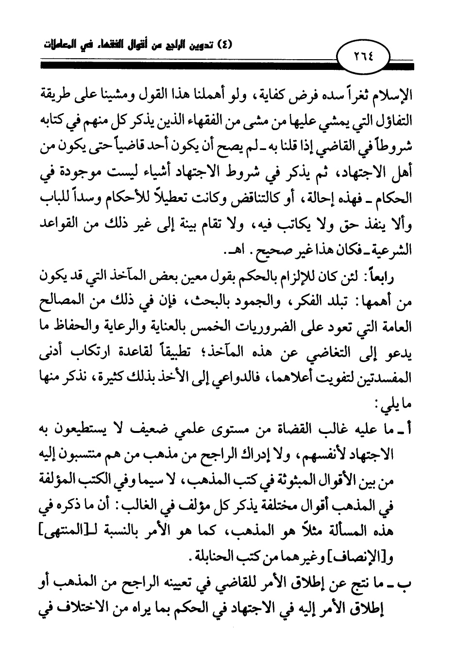 الإسلام ثغرا سده فرض كفاية، ولو أهملنا هذا القول ومشينا على طريقة التفاؤل التي يمشي عليها من مشى من الفقهاء الذين يذكر كل منهم في كتابه شروطا في القاضي إذا قلنا به - لم يصح أن يكون أحد قاضيا حتى يكون من أهل الاجتهاد، ثم يذكر في شروط الاجتهاد أشياء ليست موجودة في الحكام - فهذه إحالة، أو كالتناقض وكانت تعطيلا للأحكام وسدا للباب وألا ينفذ حق ولا يكاتب فيه، ولا تقام بينة إلى غير ذلك من القواعد الشرعية - فكان هذا غير صحيح. اهـ.
