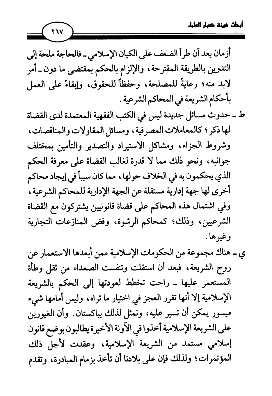 ي - هناك مجموعة من الحكومات الإسلامية ممن أبعدها الاستعمار عن روح الشريعة، فبعد أن استقلت وتنفست الصعداء من ثقل وطأة المستعمر عليها - راحت تخطط لعودتها إلى الحكم بالشريعة الإسلامية إلا أنها تقرر العجز في اختيار ما تراه، وليس أمامها شيء ميسور يمكن أن تسير عليه، ونمثل لذلك بباكستان. وأن الغيورين على الشريعة الإسلامية أخذوا في الآونة الأخيرة يطالبون بوضع قانون إسلامي مستمد من الشريعة الإسلامية، وعقدت لأجل ذلك المؤتمرات؛ ولذلك فإن على بلادنا أن تأخذ بزمام المبادرة، وتقدم
