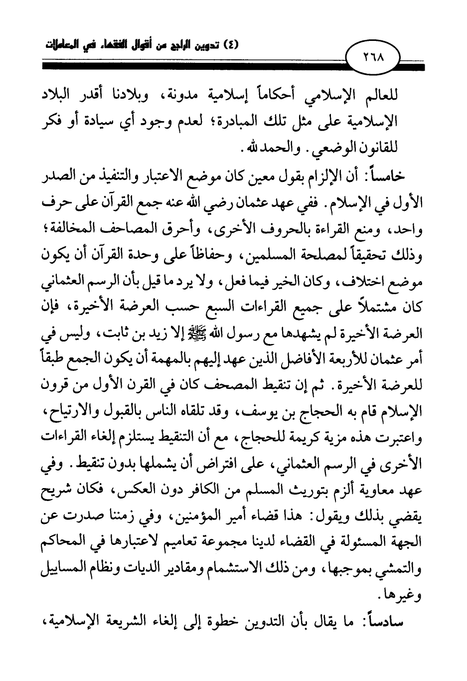 خامسا: أن الإلزام بقول معين كان موضع الاعتبار والتنفيذ من الصدر الأول في الإسلام. ففي عهد عثمان رضي الله عنه جمع القرآن على حرف واحد، ومنع القراءة بالحروف الأخرى، وأحرق المصاحف المخالفة؛ وذلك تحقيقا لمصلحة المسلمين، وحفاظا على وحدة القرآن أن يكون موضع اختلاف، وكان الخير فيما فعل، ولا يرد ما قيل بأن الرسم العثماني كان مشتملا على جميع القراءات السبع حسب العرضة الأخيرة، فإن العرضة الأخيرة لم يشهدها مع رسول الله صلى الله عليه وسلم إلا زيد بن ثابت، وليس في أمر عثمان للأربعة الأفاضل الذين عهد إليهم بالمهمة أن يكون الجمع طبقا للعرضة الأخيرة. ثم إن تنقيط المصحف كان في القرن الأول من قرون الإسلام قام به الحجاج بن يوسف، وقد تلقاه الناس بالقبول والارتياح، واعتبرت هذه مزية كريمة للحجاج، مع أن التنقيط يستلزم إلغاء القراءات الأخرى في الرسم العثماني، على افتراض أن يشملها بدون تنقيط. وفي عهد معاوية ألزم بتوريث المسلم من الكافر دون العكس، فكان شريح يقضي بذلك ويقول: هذا قضاء أمير المؤمنين، وفي زمننا صدرت عن الجهة المسئولة في القضاء لدينا مجموعة تعاميم لاعتبارها في المحاكم والتمشي بموجبها، ومن ذلك الاستشمام ومقادير الديات ونظام المساييل وغيرها.