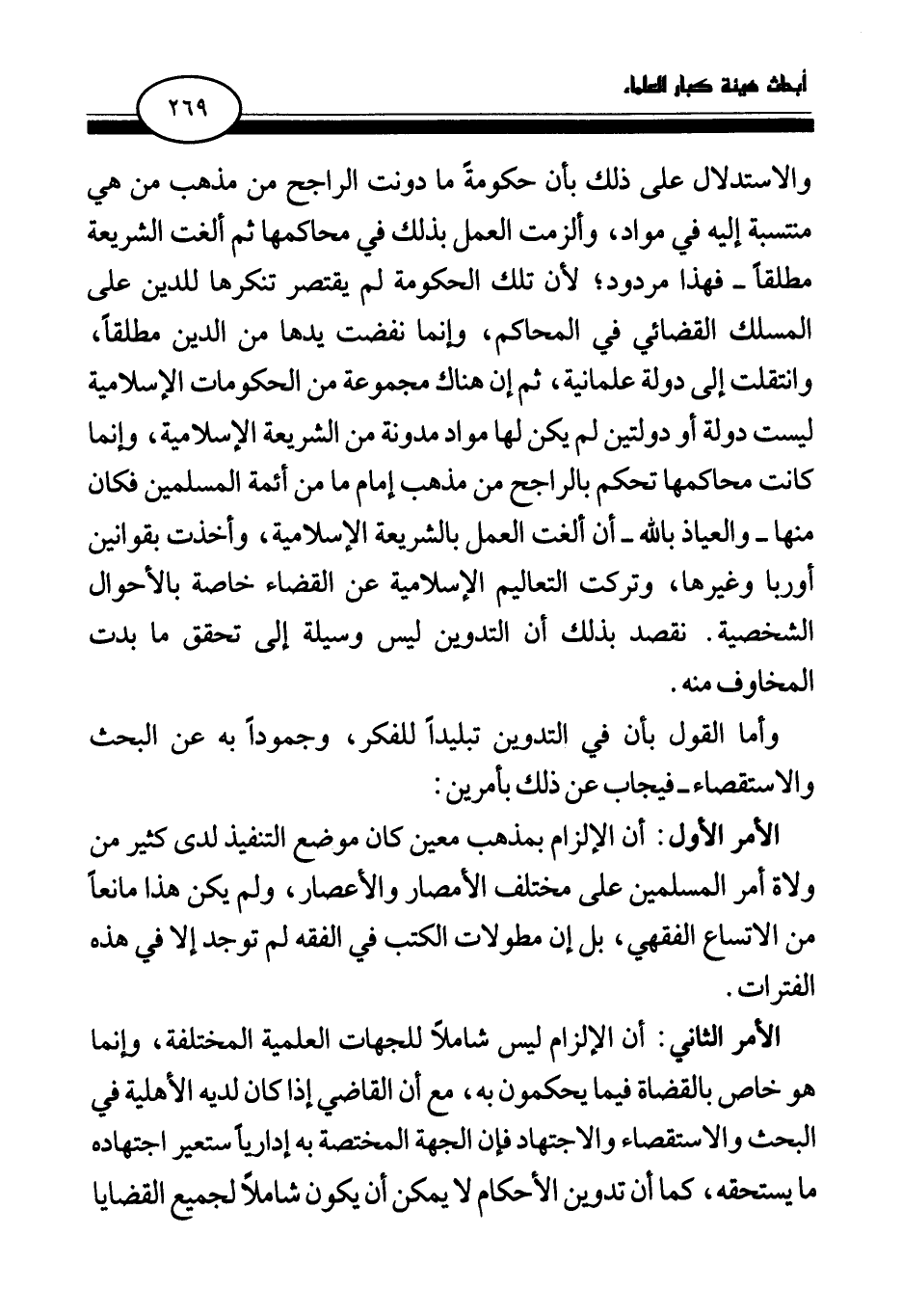 والاستدلال على ذلك بأن حكومة ما دونت الراجح من مذهب من هي منتسبة إليه في مواد، وألزمت العمل بذلك في محاكمها ثم ألغت الشريعة مطلقا - فهذا مردود؛ لأن تلك الحكومة لم يقتصر تنكرها للدين على المسلك القضائي في المحاكم، وإنما نفضت يدها من الدين مطلقا، وانتقلت إلى دولة علمانية، ثم إن هناك مجموعة من الحكومات الإسلامية ليست دولة أو دولتين لم يكن لها مواد مدونة من الشريعة الإسلامية، وإنما كانت محاكمها تحكم بالراجح من مذهب إمام ما من أئمة المسلمين فكان منها - والعياذ بالله - أن ألغت العمل بالشريعة الإسلامية، وأخذت بقوانين أوروبا وغيرها، وتركت التعاليم الإسلامية عن القضاء خاصة بالأحوال الشخصية. نقصد بذلك أن التدوين ليس وسيلة إلى تحقق ما بدت المخاوف منه.