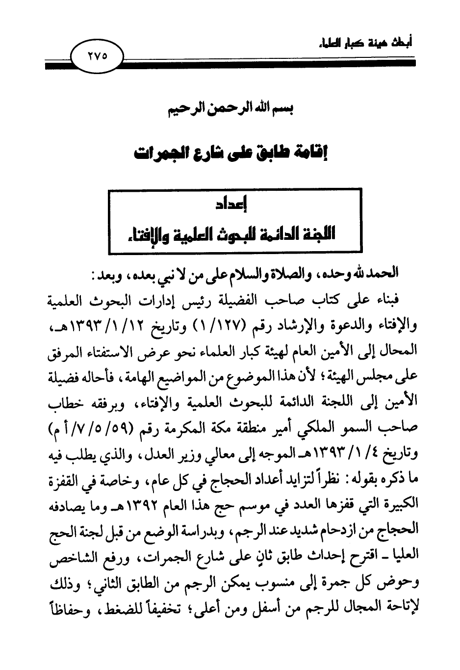 فبناء على كتاب صاحب الفضيلة رئيس إدارات البحوث العلمية والإفتاء والدعوة والإرشاد رقم (127\1) وتاريخ 12\1\1393 هـ، المحال إلى الأمين العام لهيئة كبار العلماء نحو عرض الاستفتاء المرفق على مجلس الهيئة؛ لأن هذا الموضوع من المواضيع الهامة، فأحاله فضيلة الأمين إلى اللجنة الدائمة للبحوث العلمية والإفتاء، وبرفقه خطاب صاحب السمو الملكي أمير منطقة مكة المكرمة رقم (59\5\7\ أم) وتاريخ 4\1\1393 هـ الموجه إلى معالي وزير العدل، والذي يطلب فيه ما ذكره بقوله: نظرا لتزايد أعداد الحجاج في كل عام، وخاصة في القفزة الكبيرة التي قفزها العدد في موسم حج هذا العام 1392 هـ وما يصادفه الحجاج من ازدحام شديد عند الرجم، وبدراسة الوضع من قبل لجنة الحج العليا - اقترح إحداث طابق ثان على شارع الجمرات، ورفع الشاخص وحوض كل جمرة إلى منسوب يمكن الرجم من الطابق الثاني؛ وذلك لإتاحة المجال للرجم من أسفل ومن أعلى؛ تخفيفا للضغط، وحفاظا