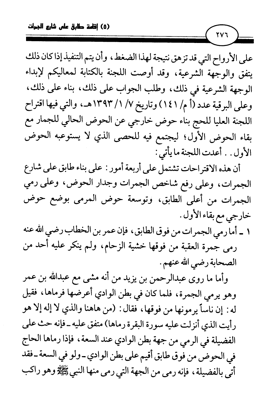 على الأرواح التي قد تزهق نتيجة لهذا الضغط، وأن يتم التنفيذ إذا كان ذلك يتفق والوجهة الشرعية، وقد أوصت اللجنة بالكتابة لمعاليكم لإبداء الوجهة الشرعية في ذلك، وطلب الجواب على ذلك، بناء على ذلك، وعلى البرقية عدد (أم \141) وتاريخ 7\1\1393 هـ، والتي فيها اقتراح اللجنة العليا للحج بناء حوض خارجي عن الحوض الحالي للجمار مع بقاء الحوض الأول؛ ليجتمع فيه للحصى الذي لا يستوعبه الحوض الأول. . أعدت اللجنة ما يأتي: