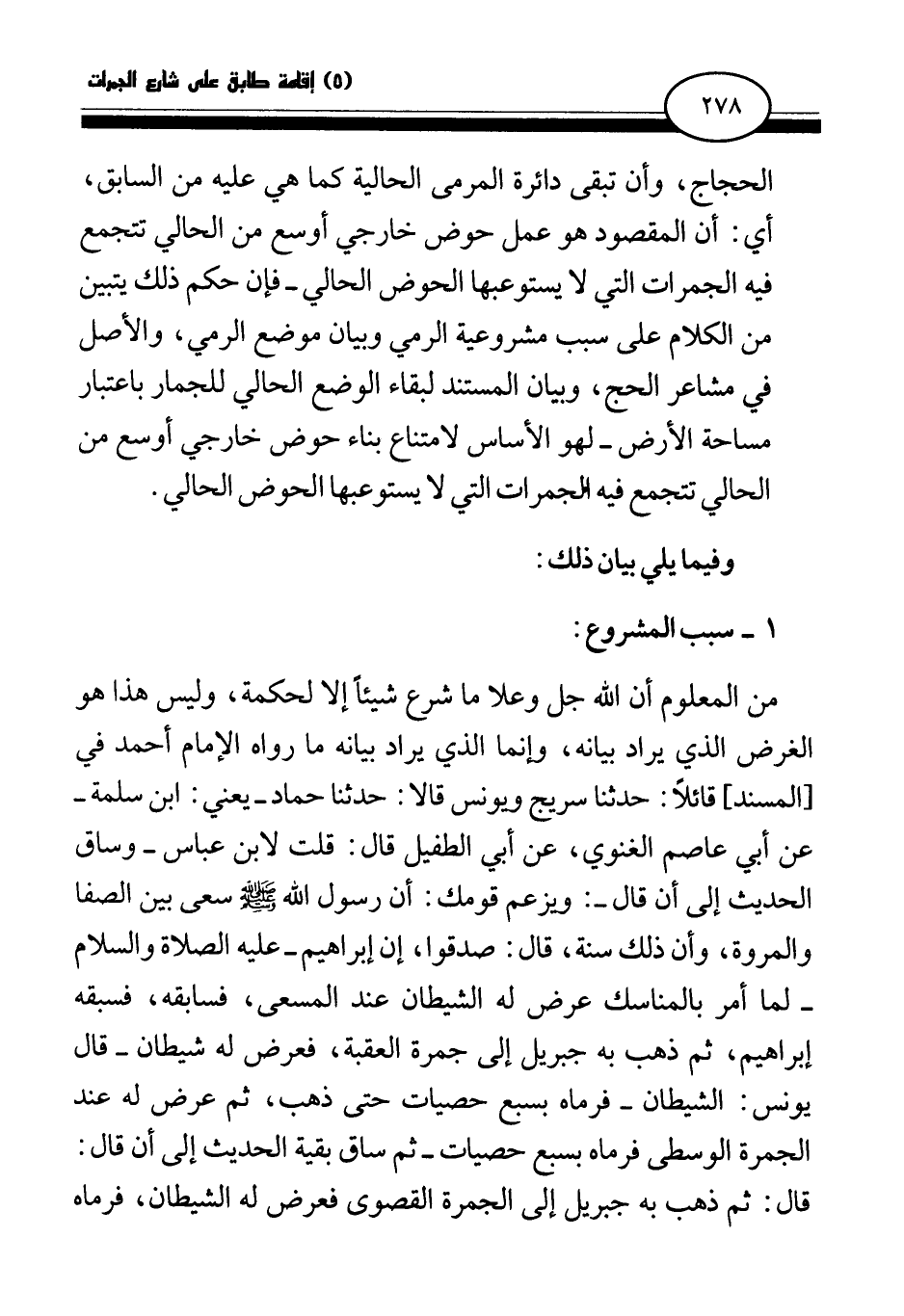 الحجاج، وأن تبقى دائرة المرمى الحالية كما هي عليه من السابق، أي: أن المقصود هو عمل حوض خارجي أوسع من الحالي تتجمع فيه الجمرات التي لا يستوعبها الحوض الحالي - فإن حكم ذلك يتبين من الكلام على سبب مشروعية الرمي وبيان موضع الرمي، والأصل في مشاعر الحج، وبيان المستند لبقاء الوضع الحالي للجمار باعتبار مساحة الأرض - لهو الأساس لامتناع بناء حوض خارجي أوسع من الحالي تتجمع فيه الجمرات التي لا يستوعبها الحوض الحالي.
