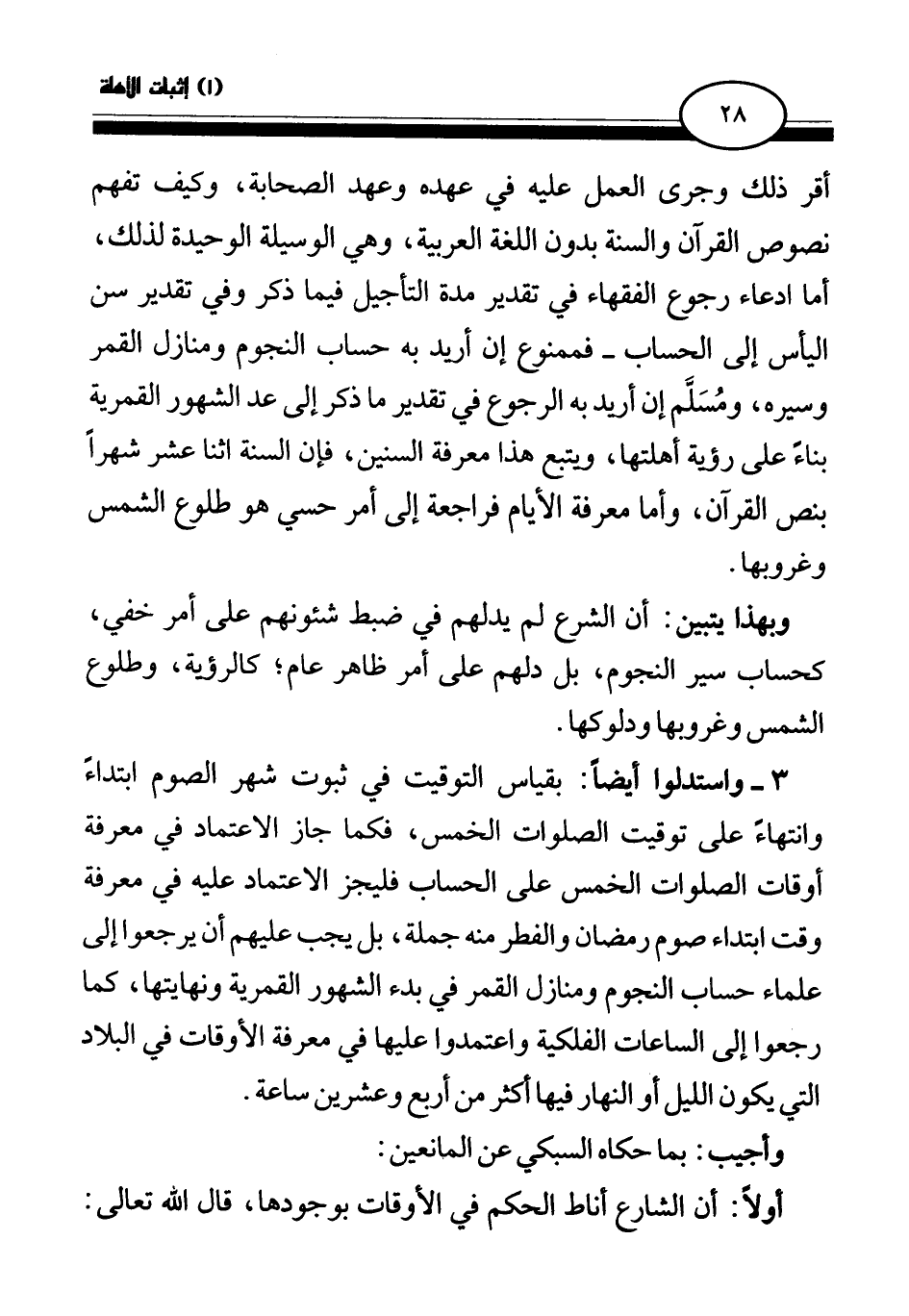 أقر ذلك وجرى العمل عليه في عهده وعهد الصحابة، وكيف تفهم نصوص القرآن والسنة بدون اللغة العربية، وهي الوسيلة الوحيدة لذلك، أما ادعاء رجوع الفقهاء في تقدير مدة التأجيل فيما ذكر وفي تقدير سن اليأس إلى الحساب- فممنوع إن أريد به حساب النجوم ومنازل القمر وسيره، ومسلم إن أريد به الرجوع في تقدير ما ذكر إلى عد الشهور القمرية بناء على رؤية أهلتها، ويتبع هذا معرفة السنين، فإن السنة اثنا عشر شهرا بنص القرآن، وأما معرفة الأيام فراجعة إلى أمر حسي هو طلوع الشمس وغروبها.