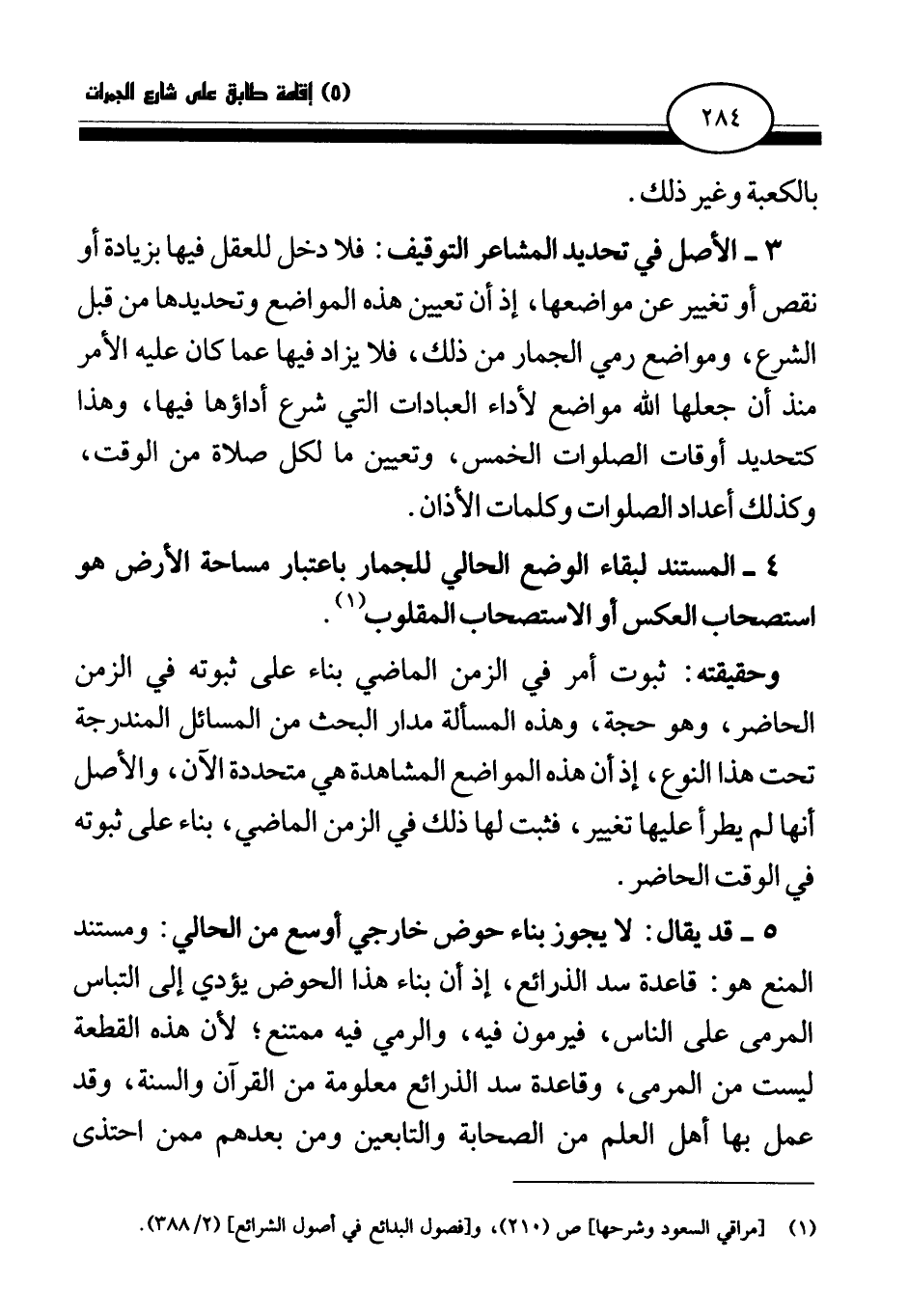 5 - قد يقال: لا يجوز بناء حوض خارجي أوسع من الحالي: ومستند المنع هو: قاعدة سد الذرائع، إذ أن بناء هذا الحوض يؤدي إلى التباس المرمى على الناس، فيرمون فيه، والرمي فيه ممتنع؛ لأن هذه القطعة ليست من المرمى، وقاعدة سد الذرائع معلومة من القرآن والسنة، وقد عمل بها أهل العلم من الصحابة والتابعين ومن بعدهم ممن احتذى