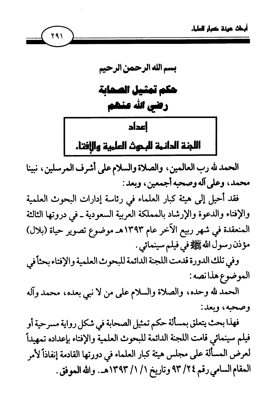 فهذا بحث يتعلق بمسألة حكم تمثيل الصحابة في شكل رواية مسرحية أو فيلم سينمائي قامت اللجنة الدائمة للبحوث العلمية والإفتاء بإعداده تمهيدا لعرض المسألة على مجلس هيئة كبار العلماء في دورتها القادمة إنفاذا لأمر المقام السامي رقم 24\93 وتاريخ 1\1\1393هـ. والله الموفق.