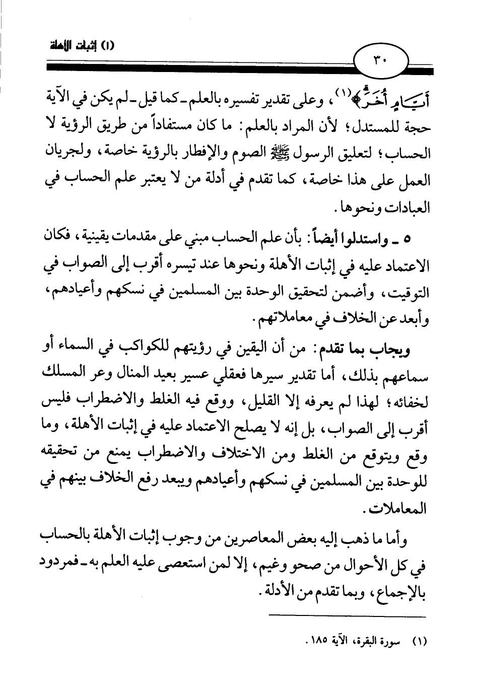 وعلى تقدير تفسيره بالعلم - كما قيل- لم يكن في الآية حجة للمستدل؛ لأن المراد بالعلم: ما كان مستفادا من طريق الرؤية لا الحساب؛ لتعليق الرسول صلى الله عليه وسلم الصوم والإفطار بالرؤية خاصة، ولجريان العمل على هذا خاصة، كما تقدم في أدلة من لا يعتبر علم الحساب في العبادات ونحوها.