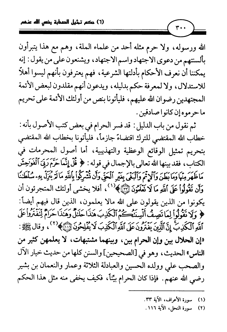 ثم نقول من باب الدليل: قد فسر الحرام في بعض كتب الأصول بأنه: خطاب الله المقتضي للترك اقتضاء جازما، فليأتونا بخطاب الله المقتضي بتحريم تمثيل الوقائع الوعظية والتهذيبية، أما أصول المحرمات في الكتاب، فقد بينها الله تعالى بالإجمال في قوله: {قُلْ إِنَّمَا حَرَّمَ رَبِّيَ الْفَوَاحِشَ مَا ظَهَرَ مِنْهَا وَمَا بَطَنَ وَالْإِثْمَ وَالْبَغْيَ بِغَيْرِ الْحَقِّ وَأَنْ تُشْرِكُوا بِاللَّهِ مَا لَمْ يُنَزِّلْ بِهِ سُلْطَانًا وَأَنْ تَقُولُوا عَلَى اللَّهِ مَا لَا تَعْلَمُونَ} (¬1) أفلا يخشى أولئك المتجرئون أن يكونوا من الذين يقولون على الله ما لا يعلمون، الذين قال فيهم أيضا: {وَلَا تَقُولُوا لِمَا تَصِفُ أَلْسِنَتُكُمُ الْكَذِبَ هَذَا حَلَالٌ وَهَذَا حَرَامٌ لِتَفْتَرُوا عَلَى اللَّهِ الْكَذِبَ إِنَّ الَّذِينَ يَفْتَرُونَ عَلَى اللَّهِ الْكَذِبَ لَا يُفْلِحُونَ} (¬2) وقال صلى الله عليه وسلم: «إن الحلال بين وإن الحرام بين، وبينهما مشتبهات، لا يعلمهن كثير من الناس (¬3) » الحديث، وهو في [الصحيحين] والسنن كلها من حديث خيار الآل والصحب علي وولده الحسين والعبادلة الثلاثة وعمار والنعمان بن بشير رضي الله عنهم. فإذا كان الحرام بينا، فكيف يخفى منه مثل هذا الحكم