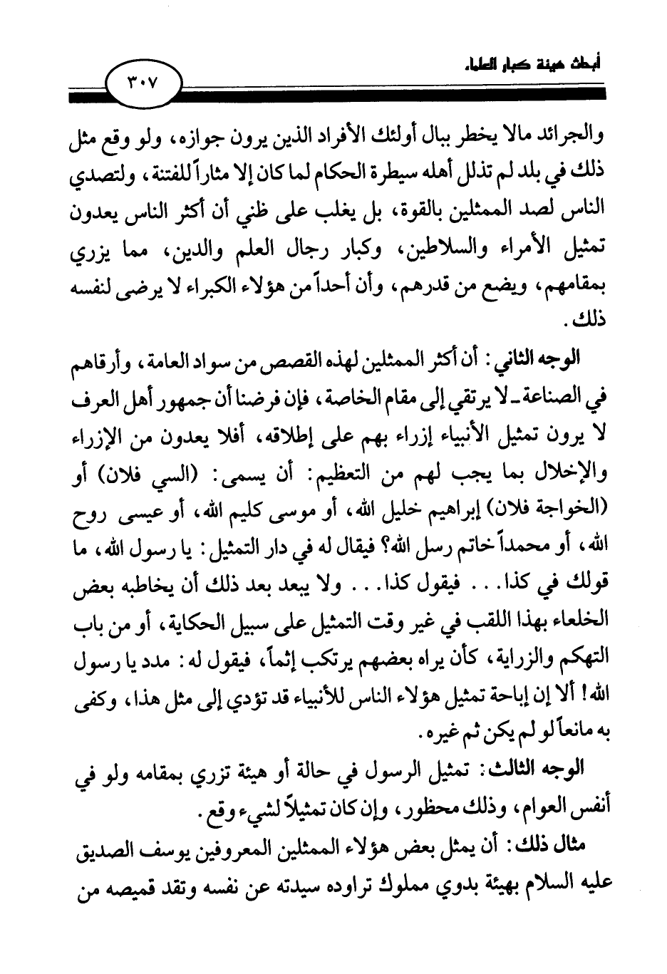 الوجه الثاني: أن أكثر الممثلين لهذه القصص من سواد العامة، وأرقاهم في الصناعة- لا يرتقي إلى مقام الخاصة، فإن فرضنا أن جمهور أهل العرف لا يرون تمثيل الأنبياء إزراء بهم على إطلاقه، أفلا يعدون من الإزراء والإخلال بما يجب لهم من التعظيم: أن يسمى: (السي فلان) أو (الخواجة فلان) إبراهيم خليل الله، أو موسى كليم الله، أو عيسى روح الله، أو محمدا خاتم رسل الله؟ فيقال له في دار التمثيل: يا رسول الله، ما قولك في كذا. . . فيقول كذا. . . ولا يبعد بعد ذلك أن يخاطبه بعض الخلعاء بهذا اللقب في غير وقت التمثيل على سبيل الحكاية، أو من باب التهكم والزراية، كأن يراه بعضهم يرتكب إثما، فيقول له: مدد يا رسول الله! ألا إن إباحة تمثيل هؤلاء الناس للأنبياء قد تؤدي إلى مثل هذا، وكفى به مانعا لو لم يكن ثم غيره.
