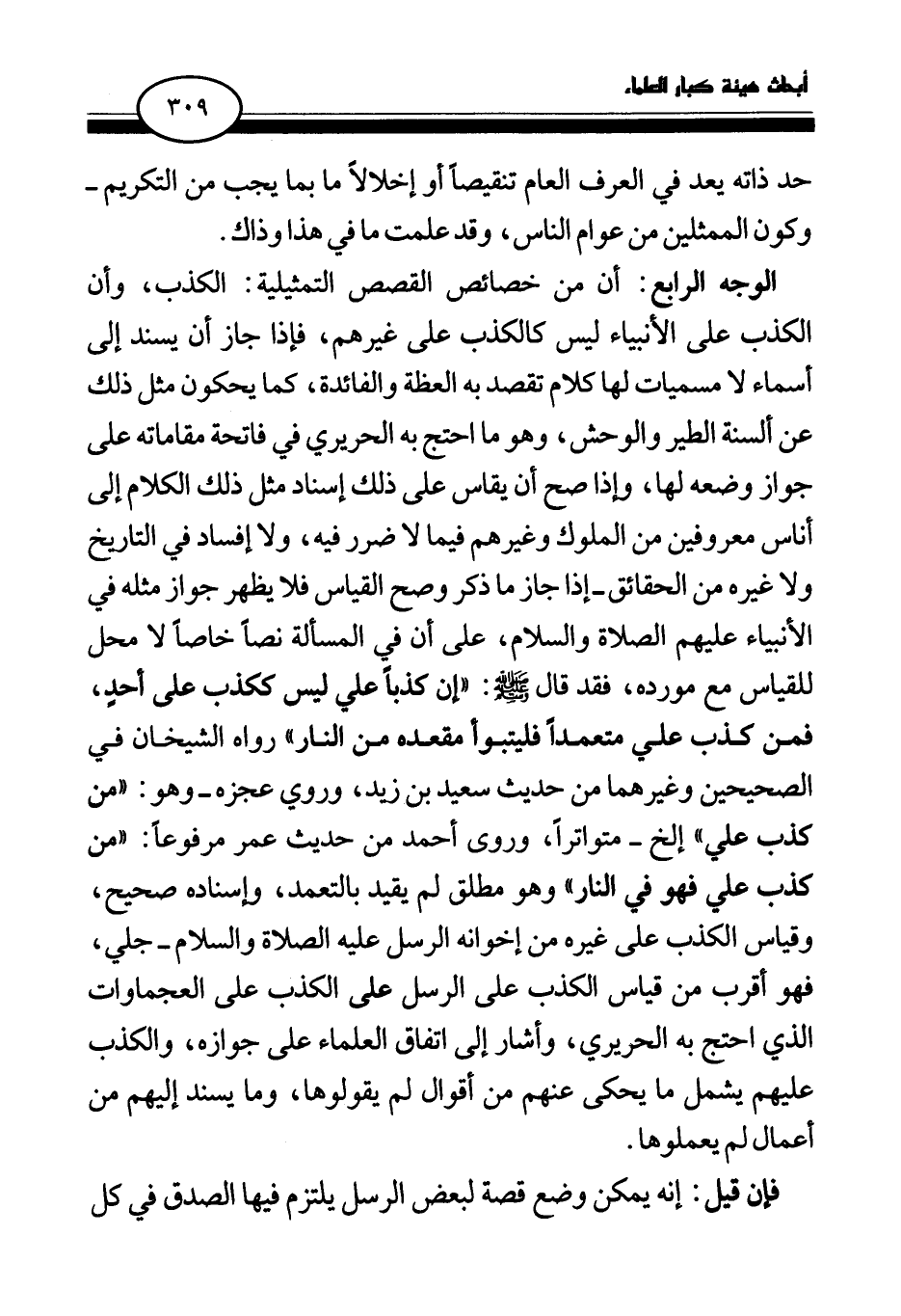 الوجه الرابع: أن من خصائص القصص التمثيلية: الكذب، وأن الكذب على الأنبياء ليس كالكذب على غيرهم، فإذا جاز أن يسند إلى أسماء لا مسميات لها كلام تقصد به العظة والفائدة، كما يحكون مثل ذلك عن ألسنة الطير والوحش، وهو ما احتج به الحريري في فاتحة مقاماته على جواز وضعه لها، وإذا صح أن يقاس على ذلك إسناد مثل ذلك الكلام إلى أناس معروفين من الملوك وغيرهم فيما لا ضرر فيه، ولا إفساد في التاريخ ولا غيره من الحقائق - إذا جاز ما ذكر وصح القياس فلا يظهر جواز مثله في الأنبياء عليهم الصلاة والسلام، على أن في المسألة نصا خاصا لا محل للقياس مع مورده، فقد قال صلى الله عليه وسلم: «إن كذبا علي ليس ككذب على أحد، فمن كذب علي متعمدا فليتبوأ مقعده من النار (¬1) » رواه الشيخان في الصحيحين وغيرهما من حديث سعيد بن زيد، وروي عجزه - وهو: "من كذب علي" إلخ متواترا، وروى أحمد من حديث عمر مرفوعا: «من كذب علي فهو في النار (¬2) » وهو مطلق لم يقيد بالتعمد، وإسناده صحيح، وقياس الكذب على غيره من إخوانه الرسل عليه الصلاة والسلام - جلي، فهو أقرب من قياس الكذب على الرسل على الكذب على العجماوات الذي احتج به الحريري، وأشار إلى اتفاق العلماء على جوازه، والكذب عليهم يشمل ما يحكى عنهم من أقوال لم يقولوها، وما يسند إليهم من أعمال لم يعملوها.