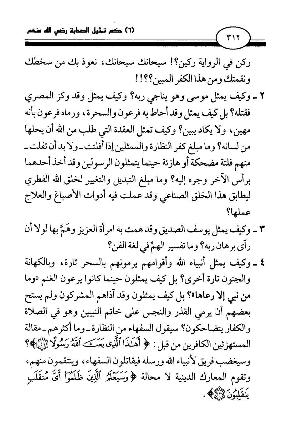 2 - وكيف يمثل موسى وهو يناجي ربه؟ وكيف يمثل وقد وكز المصري فقتله؟ بل كيف يمثل وقد أحاط به فرعون والسحرة، ورماه فرعون بأنه مهين، ولا يكاد يبين؟ وكيف تمثل العقدة التي طلب من الله أن يحلها من لسانه؟ وما مبلغ كفر النظارة والممثلين إذا أفلتت - ولا بد أن تفلت - منهم فلتة مضحكة أو هازئة حينما يتمثلون الرسولين وقد أخذ أحدهما برأس الآخر وجره إليه؟ وما مبلغ التبديل والتغيير لخلق الله الفطري ليطابق هذا الخلق الصناعي وقد عملت فيه أدوات الأصباغ والعلاج عملها؟