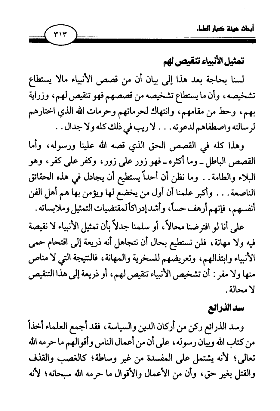 على أنا لو افترضنا محالا، أو سلمنا جدلا بأن تمثيل الأنبياء لا نقيصة فيه ولا مهانة، فلن نستطيع بحال أن نتجاهل أنه ذريعة إلى اقتحام حمى الأنبياء وابتذالهم، وتعريضهم للسخرية والمهانة، فالنتيجة التي لا مناص منها ولا مفر: أن تشخيص الأنبياء تنقيص لهم، أو ذريعة إلى هذا التنقيص لا محالة.