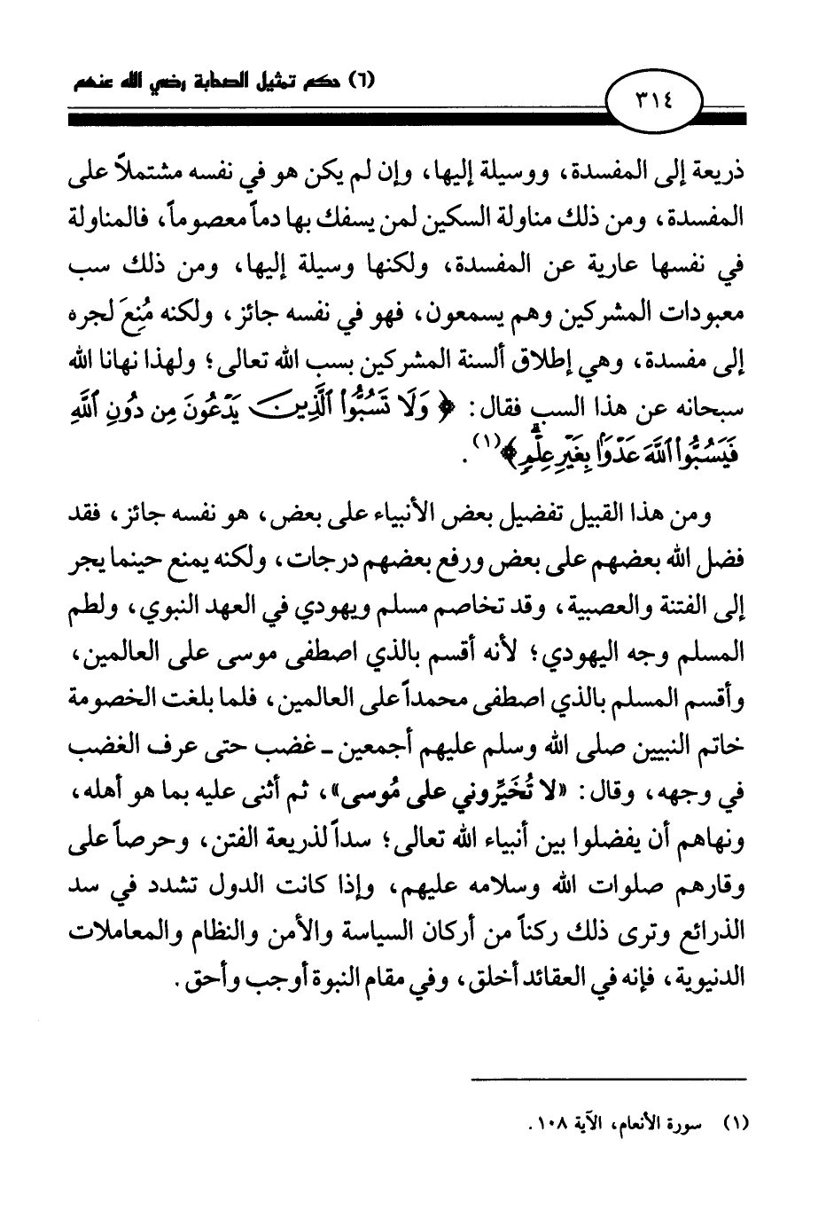 ومن هذا القبيل تفضيل بعض الأنبياء على بعض، هو نفسه جائز، فقد فضل الله بعضهم على بعض ورفع بعضهم درجات، ولكنه يمنع حينما يجر إلى الفتنة والعصبية، وقد تخاصم مسلم ويهودي في العهد النبوي، ولطم المسلم وجه اليهودي؛ لأنه أقسم بالذي اصطفى موسى على العالمين، وأقسم المسلم بالذي اصطفى محمدا على العالمين، فلما بلغت الخصومة خاتم النبيين صلى الله وسلم عليهم أجمعين - غضب حتى عرف الغضب في وجهه، وقال: «لا تخيروني على موسى (¬2) » ، ثم أثنى عليه بما هو أهله، ونهاهم أن يفضلوا بين أنبياء الله تعالى؛ سدا لذريعة الفتن، وحرصا على وقارهم صلوات الله وسلامه عليهم، وإذا كانت الدول تشدد في سد الذرائع وترى ذلك ركنا من أركان السياسة والأمن والنظام والمعاملات الدنيوية، فإنه في العقائد أخلق، وفي مقام النبوة أوجب وأحق.