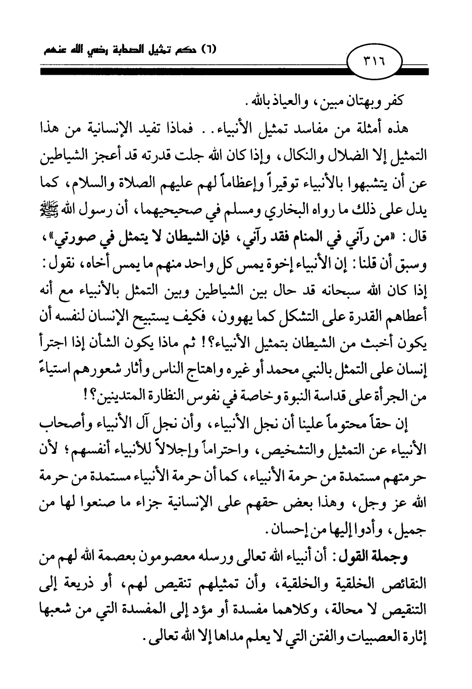 وجملة القول: أن أنبياء الله تعالى ورسله معصومون بعصمة الله لهم من النقائص الخلقية والخلقية، وأن تمثيلهم تنقيص لهم، أو ذريعة إلى التنقيص لا محالة، وكلاهما مفسدة أو مؤد إلى المفسدة التي من شعبها إثارة العصبيات والفتن التي لا يعلم مداها إلا الله تعالى.
