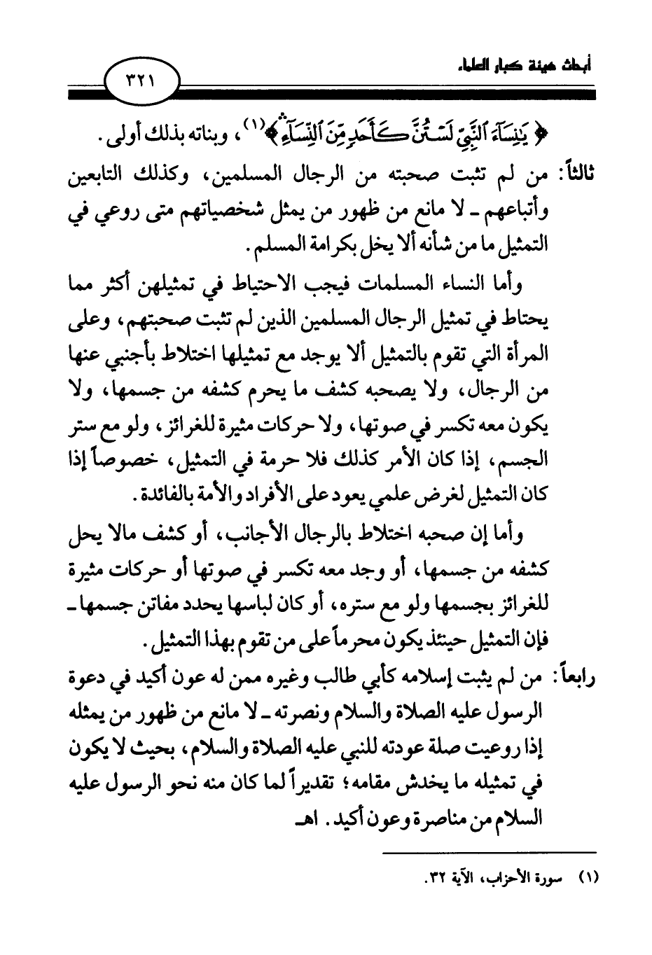 وأما النساء المسلمات فيجب الاحتياط في تمثيلهن أكثر مما يحتاط في تمثيل الرجال المسلمين الذين لم نثبت صحبتهم، وعلى المرأة التي تقوم بالتمثيل ألا يوجد مع تمثيلها اختلاط بأجنبي عنها من الرجال، ولا يصحبه كشف ما يحرم كشفه من جسمها، ولا يكون معه تكسر في صوتها، ولا حركات مثيرة للغرائز، ولو مع ستر الجسم، إذا كان الأمر كذلك فلا حرمة في التمثيل، خصوصا إذا كان التمثيل لغرض علمي يعود على الأفراد والأمة بالفائدة.