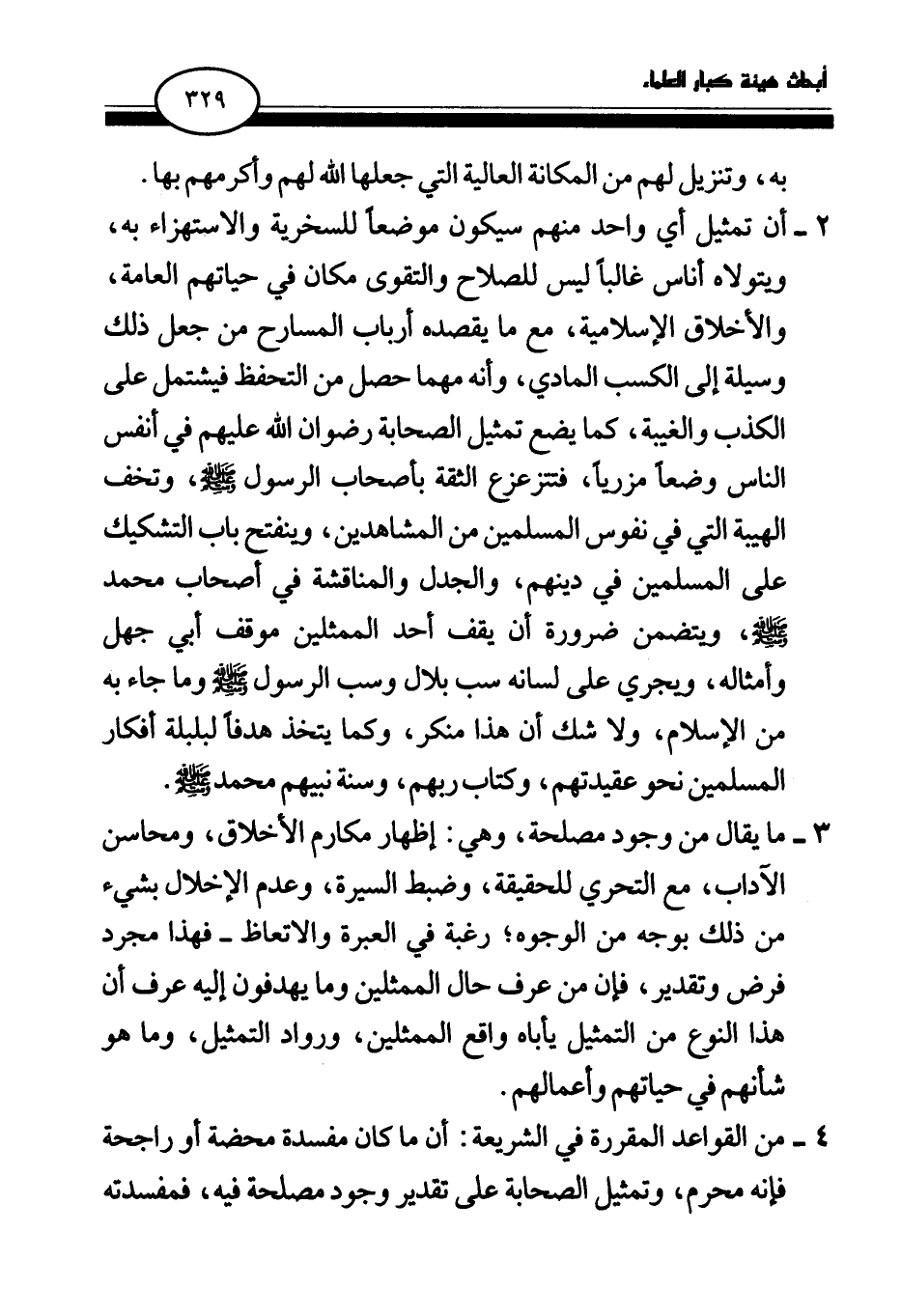 2 - أن تمثيل أي واحد منهم سيكون موضعا للسخرية والاستهزاء به، ويتولاه أناس غالبا ليس للصلاح والتقوى مكان في حياتهم العامة، والأخلاق الإسلامية، مع ما يقصده أرباب المسارح من جعل ذلك وسيلة إلى الكسب المادي، وأنه مهما حصل من التحفظ فيشتمل على الكذب والغيبة، كما يضع تمثيل الصحابة رضوان الله عليهم في أنفس الناس وضعا مزريا، فتتزعزع الثقة بأصحاب الرسول صلى الله عليه وسلم، وتخف الهيبة التي في نفوس المسلمين من المشاهدين، وينفتح باب التشكيك على المسلمين في دينهم، والجدل والمناقشة في أصحاب محمد صلى الله عليه وسلم، ويتضمن ضرورة أن يقف أحد الممثلين موقف أبي جهل وأمثاله، ويجري على لسانه سب بلال وسب الرسول صلى الله عليه وسلم وما جاء به من الإسلام، ولا شك أن هذا منكر، وكما يتخذ هدفا لبلبلة أفكار المسلمين نحو عقيدتهم، وكتاب ربهم، وسنة نبيهم محمد صلى الله عليه وسلم.