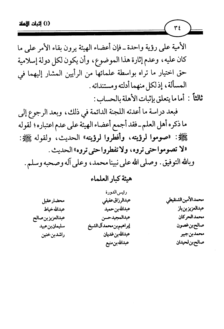 الأمية على رؤية واحدة - فإن أعضاء الهيئة يرون بقاء الأمر على ما كان عليه، وعدم إثارة هذا الموضوع، وأن يكون لكل دولة إسلامية حق اختيار ما تراه بواسطة علمائها من الرأيين المشار إليهما في المسألة، إذ لكل منهما أدلته ومستنداته.