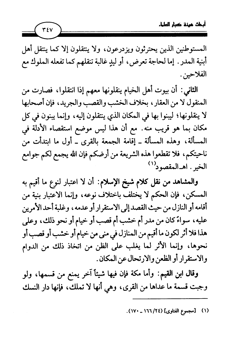 الثاني: أن بيوت أهل الخيام ينقلونها معهم إذا انتقلوا، فصارت من المنقول لا من العقار، بخلاف الخشب والقصب والجريد، فإن أصحابها لا ينقلونها؛ ليبنوا بها في المكان الذي ينتقلون إليه، وإنما يبنون في كل مكان بما هو قريب منه. مع أن هذا ليس موضع استقصاء الأدلة في المسألة، وهذه المسألة- إقامة الجمعة بالقرى - أول ما ابتدأت من ناحيتكم، فلا تقطعوا هذه الشريعة من أرضكم فإن الله يجمع لكم جوامع الخير. اهـ المقصود (¬1) .