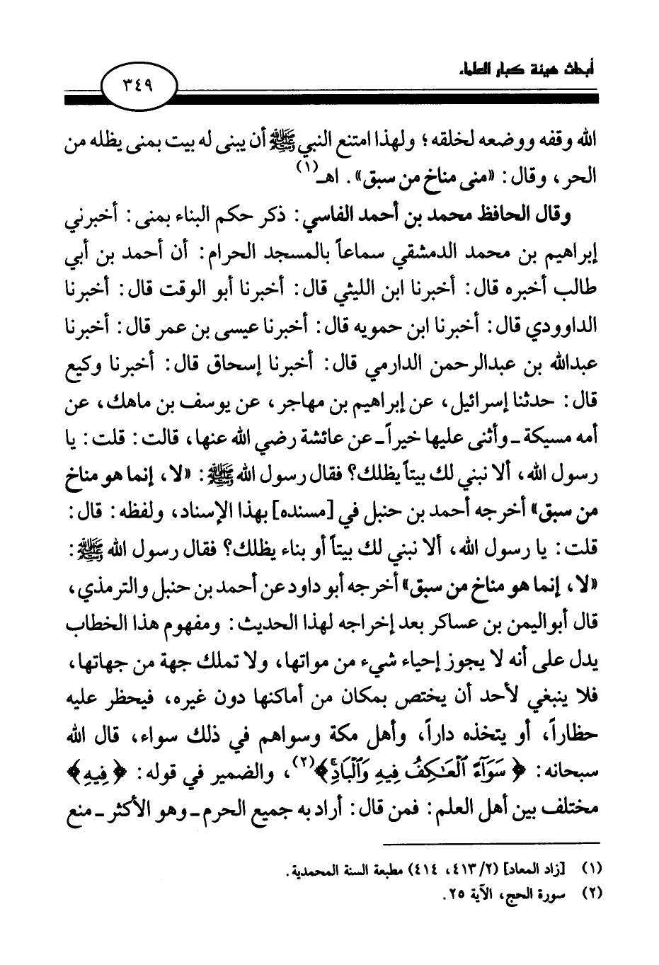 وقال الحافظ محمد بن أحمد الفاسي: ذكر حكم البناء بمنى: أخبرني إبراهيم بن محمد الدمشقي سماعا بالمسجد الحرام: أن أحمد بن أبي طالب أخبره قال: أخبرنا ابن الليثي قال: أخبرنا أبو الوقت قال: أخبرنا الداودي قال: أخبرنا ابن حمويه قال: أخبرنا عيسى بن عمر قال: أخبرنا عبد الله بن عبد الرحمن الدارمي قال: أخبرنا إسحاق قال: أخبرنا وكيع قال: حدثنا إسرائيل، عن إبراهيم بن مهاجر، عن يوسف بن ماهك، عن أمه مسيكة - وأثنى عليها خيرا- عن عائشة رضي الله عنها، قالت: قلت: يا رسول الله، ألا نبني لك بيتا يظلك؟ «فقال رسول الله صلى الله عليه وسلم: لا، إنما هو مناخ من سبق (¬3) » أخرجه أحمد بن حنبل في [مسنده] بهذا الإسناد، ولفظه: قال: قلت: يا رسول الله، ألا نبني لك بيتا أو بناء يظلك؟ «فقال رسول الله صلى الله عليه وسلم: لا، إنما هو مناخ من سبق (¬4) » أخرجه أبو داود عن أحمد بن حنبل والترمذي، قال أبو اليمن بن عساكر بعد إخراجه لهذا الحديث: ومفهوم هذا الخطاب يدل على أنه لا يجوز إحياء شيء من مواتها، ولا تملك جهة من جهاتها، فلا ينبغي لأحد أن يختص بمكان من أماكنها دون غيره، فيحظر عليه حظارا، أو يتخذه دارا، وأهل مكة وسواهم في ذلك سواء، قال الله سبحانه: {سَوَاءً الْعَاكِفُ فِيهِ وَالْبَادِ} (¬5) والضمير في قوله: فيه مختلف بين أهل العلم: فمن قال: أراد به جميع الحرم - وهو الأكثر- منع