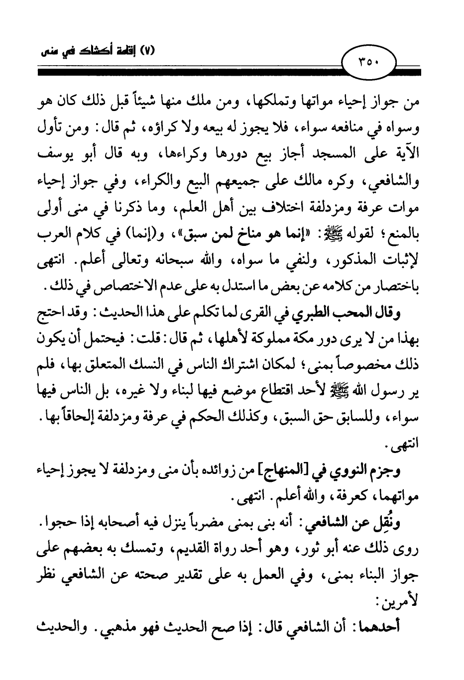 وقال المحب الطبري في القرى لما تكلم على هذا الحديث: وقد احتج بهذا من لا يرى دور مكة مملوكة لأهلها، ثم قال: قلت: فيحتمل أن يكون ذلك مخصوصا بمنى؛ لمكان اشتراك الناس في النسك المتعلق بها، فلم ير رسول الله صلى الله عليه وسلم لأحد اقتطاع موضع فيها لبناء ولا غيره، بل الناس فيها سواء، وللسابق حق السبق، وكذلك الحكم في عرفة ومزدلفة إلحاقا بها. انتهى.