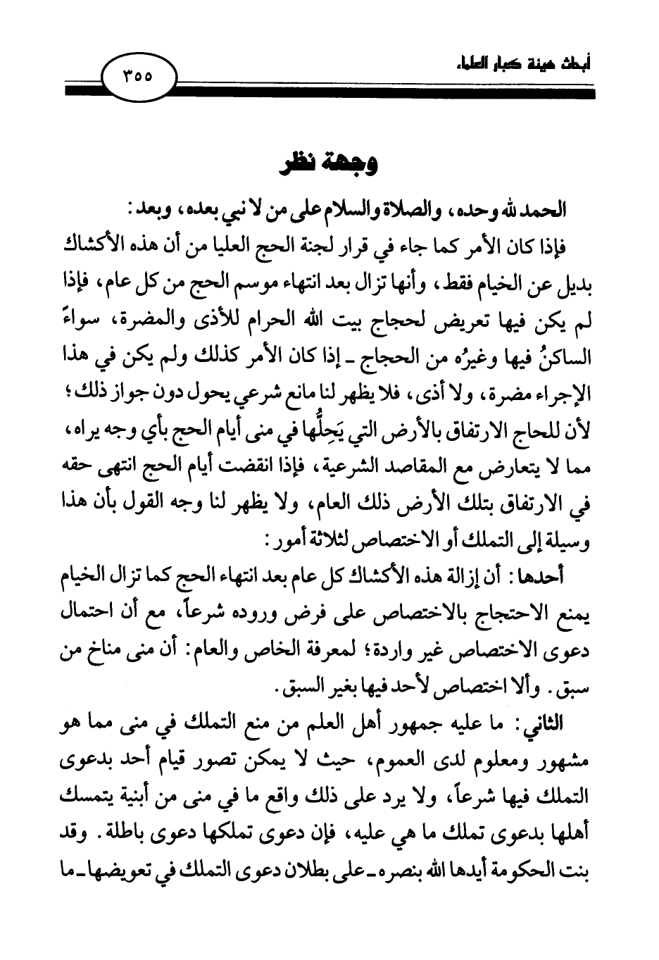 فإذا كان الأمر كما جاء في قرار لجنة الحج العليا من أن هذه الأكشاك بديل عن الخيام فقط، وأنها تزال بعد انتهاء موسم الحج من كل عام، فإذا لم يكن فيها تعريض لحجاج بيت الله الحرام للأذى والمضرة، سواء الساكن فيها وغيره من الحجاج - إذا كان الأمر كذلك ولم يكن في هذا الإجراء مضرة ولا أذى، فلا يظهر لنا مانع شرعي يحول دون جواز ذلك؛ لأن للحاج الارتفاق بالأرض التي يحلها في منى أيام الحج بأي وجه يراه، مما لا يتعارض مع المقاصد الشرعية، فإذا انقضت أيام الحج انتهى حقه في الارتفاق بتلك الأرض ذلك العام، ولا يظهر لنا وجه القول بأن هذا وسيلة إلى التملك أو الاختصاص لثلاثة أمور: