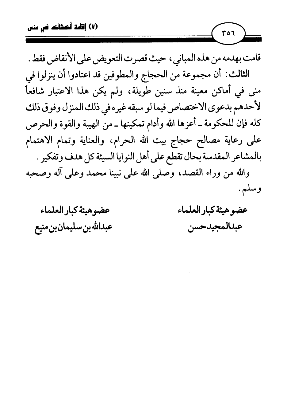 الثالث: أن مجموعة من الحجاج والمطوفين قد اعتادوا أن ينزلوا في منى في أماكن معينة منذ سنين طويلة، ولم يكن هذا الاعتبار شافعا لأحدهم بدعوى الاختصاص فيما لو سبقه غيره في ذلك المنزل وفوق ذلك كله فإن للحكومة - أعزها الله وأدام تمكينها - من الهيبة والقوة والحرص على رعاية مصالح حجاج بيت الله الحرام، والعناية وتمام الاهتمام بالمشاعر المقدسة بحال تقطع على أهل النوايا السيئة كل هدف وتفكير.