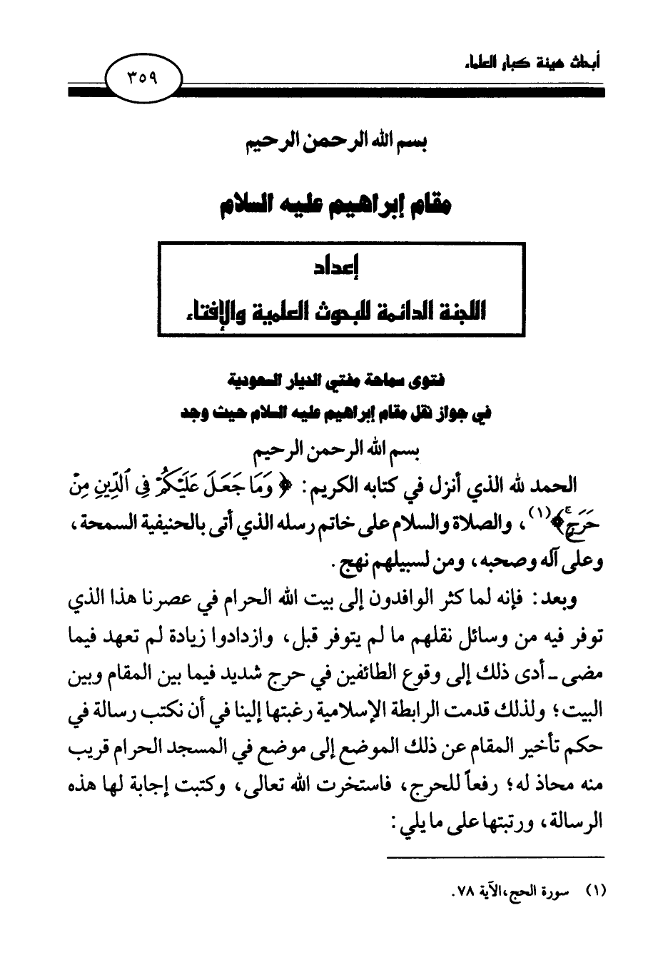 وبعد: فإنه لما كثر الوافدون إلى بيت الله الحرام في عصرنا هذا الذي توفر فيه من وسائل نقلهم ما لم يتوفر قبل، وازدادوا زيادة لم تعهد فيما مضى- أدى ذلك إلى وقوع الطائفين في حرج شديد فيما بين المقام وبين البيت؛ ولذلك قدمت الرابطة الإسلامية رغبتها إلينا في أن نكتب رسالة في حكم تأخير المقام عن ذلك الموضع إلى موضع في المسجد الحرام قريب منه محاذ له؛ رفعا للحرج، فاستخرت الله تعالى، وكتبت إجابة لها هذه الرسالة، ورتبتها على ما يلي: