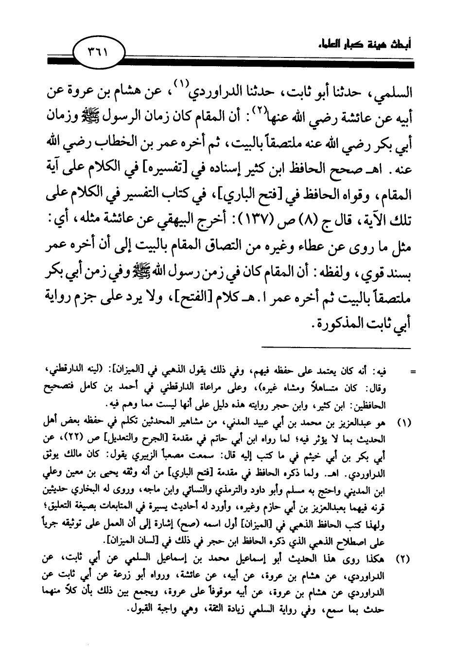 السلمي، حدثنا أبو ثابت، حدثنا الدراوردي، عن هشام بن عروة عن أبيه عن عائشة - رضي الله عنها -: «أن المقام كان زمان الرسول - صلى الله عليه وسلم - وزمان أبي بكر - رضي الله عنه - ملتصقا بالبيت، ثم أخره عمر بن الخطاب - رضي الله عنه» -. اهـ صحح الحافظ ابن كثير إسناده في [تفسيره] في الكلام على آية المقام، وقواه الحافظ في [فتح الباري] ، في كتاب التفسير في الكلام على تلك الآية، قال ج (8) ص (137) : أخرج البيهقي عن عائشة مثله، أي: مثل ما روى عن عطاء وغيره من التصاق المقام بالبيت إلى أن أخره عمر بسند قوي، ولفظه: أن المقام كان في زمن رسول الله - صلى الله عليه وسلم - وفي زمن أبي بكر ملتصقا بالبيت ثم أخره عمر ا. هـ كلام [الفتح] ، ولا يرد على جزم رواية أبي ثابت المذكورة.