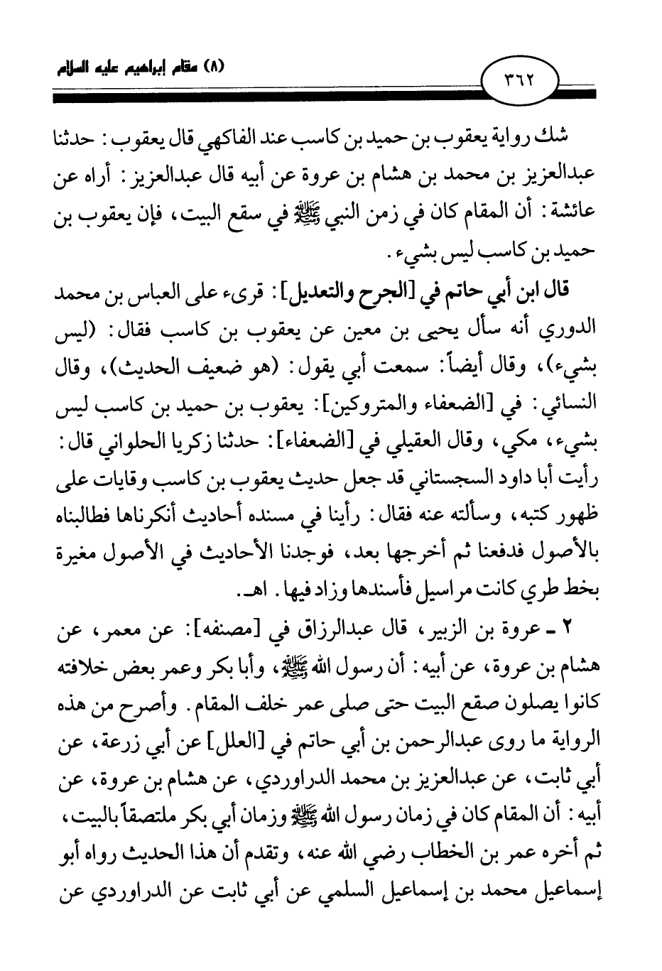 2 - عروة بن الزبير، قال عبد الرزاق في [مصنفه] : عن معمر، عن هشام بن عروة، عن أبيه: «أن رسول الله - صلى الله عليه وسلم -، وأبا بكر وعمر بعض خلافته كانوا يصلون صقع البيت حتى صلى عمر خلف المقام» . وأصرح من هذه الرواية ما روى عبد الرحمن بن أبي حاتم في [العلل] عن أبي زرعة، عن أبي ثابت، عن عبد العزيز بن محمد الدراوردي، عن هشام بن عروة، عن أبيه: «أن المقام كان في زمان رسول الله - صلى الله عليه وسلم - وزمان أبي بكر ملتصقا بالبيت، ثم أخره عمر بن الخطاب - رضي الله عنه» -، وتقدم أن هذا الحديث رواه أبو إسماعيل محمد بن إسماعيل السلمي عن أبي ثابت عن الدراوردي عن