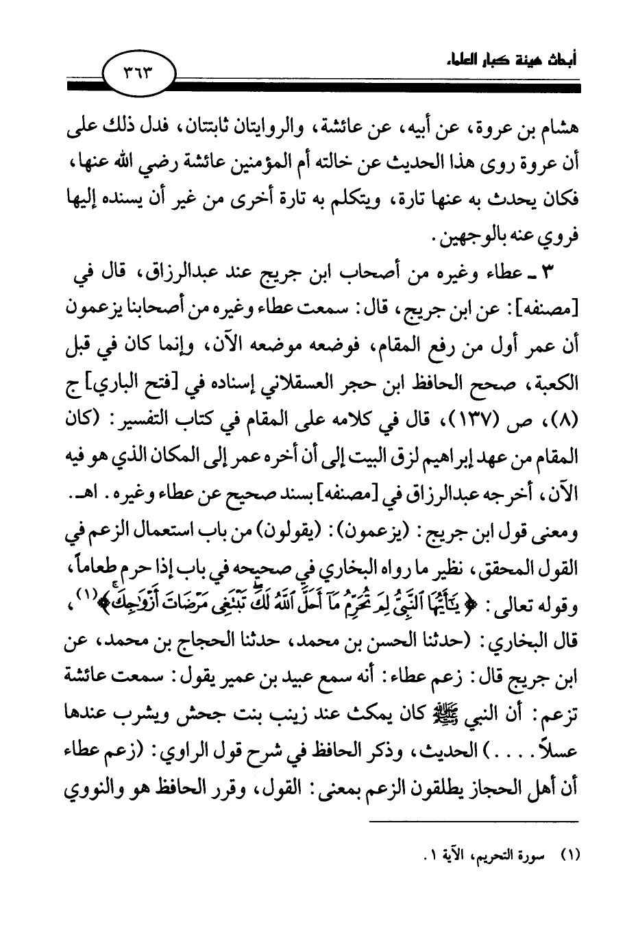 3 - عطاء وغيره من أصحاب ابن جريج عند عبد الرزاق، قال في [مصنفه] : عن ابن جريج، قال: سمعت عطاء وغيره من أصحابنا يزعمون أن عمر أول من رفع المقام، فوضعه موضعه الآن، وإنما كان في قبل الكعبة، صحح الحافظ ابن حجر العسقلاني إسناده في [فتح الباري] ج (8) ، ص (137) ، قال في كلامه على المقام في كتاب التفسير: (كان المقام من عهد إبراهيم لزق البيت إلى أن أخره عمر إلى المكان الذي هو فيه الآن، أخرجه عبد الرزاق في [مصنفه] بسند صحيح عن عطاء وغيره. اهـ. ومعنى قول ابن جريج: (يزعمون) : (يقولون) من باب استعمال الزعم في القول المحقق، نظير ما رواه البخاري في صحيحه في باب إذا حرم طعاما، وقوله تعالى: {يَا أَيُّهَا النَّبِيُّ لِمَ تُحَرِّمُ مَا أَحَلَّ اللَّهُ لَكَ تَبْتَغِي مَرْضَاتَ أَزْوَاجِكَ} (¬1) قال البخاري: (حدثنا الحسن بن محمد، حدثنا الحجاج بن محمد، عن ابن جريج قال: زعم عطاء: أنه سمع عبيد بن عمير يقول: سمعت عائشة تزعم: «أن النبي - صلى الله عليه وسلم - كان يمكث عند زينب بنت جحش ويشرب عندها عسلا (¬2) » . . . .) الحديث، وذكر الحافظ في شرح قول الراوي: (زعم عطاء أن أهل الحجاز يطلقون الزعم بمعنى: القول، وقرر الحافظ هو والنووي