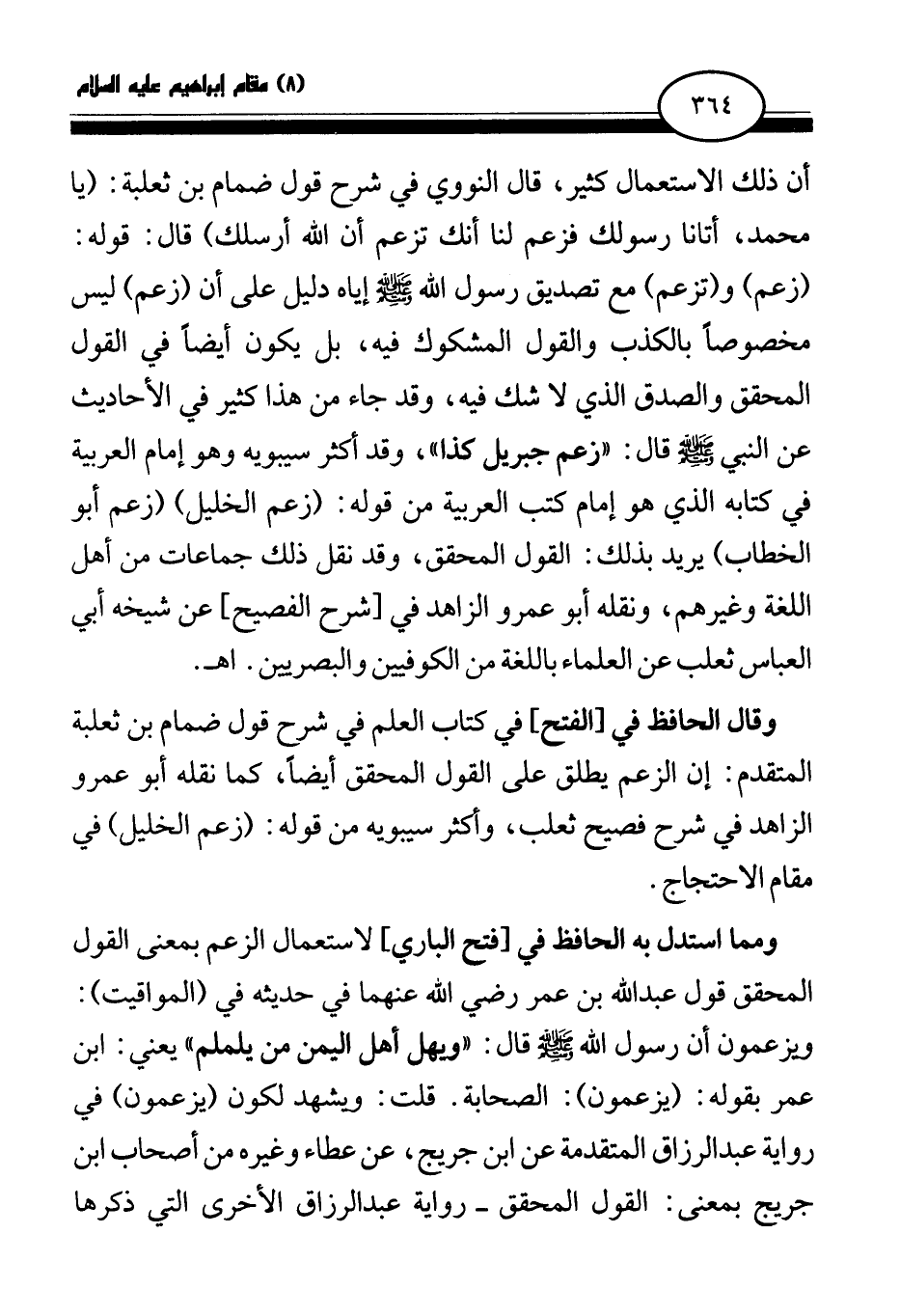 وقال الحافظ في [الفتح] في كتاب العلم في شرح قول ضمام بن ثعلبة المتقدم: إن الزعم يطلق على القول المحقق أيضا، كما نقله أبو عمرو الزاهد في شرح فصيح ثعلب، وأكثر سيبويه من قوله: (زعم الخليل) في مقام الاحتجاج.