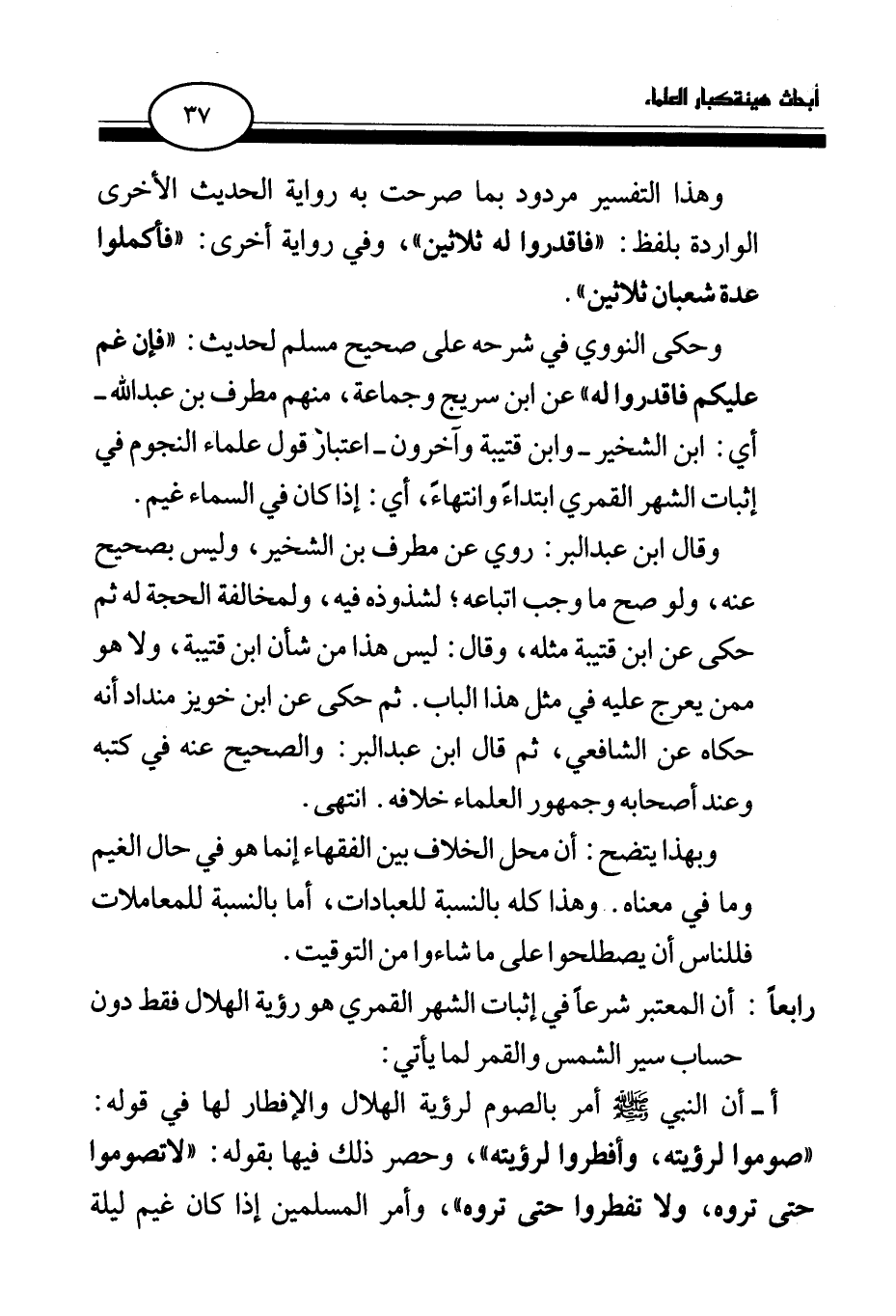 وحكى النووي في شرحه على صحيح مسلم لحديث: «فإن غم عليكم فاقدروا له (¬3) » عن ابن سريج وجماعة، ومنهم مطرف بن عبد الله - أي: ابن الشخير - وابن قتيبة وآخرون- اعتبار قول علماء النجوم في إثبات الشهر القمري ابتداء وانتهاء، أي: إذا كان في السماء غيم.