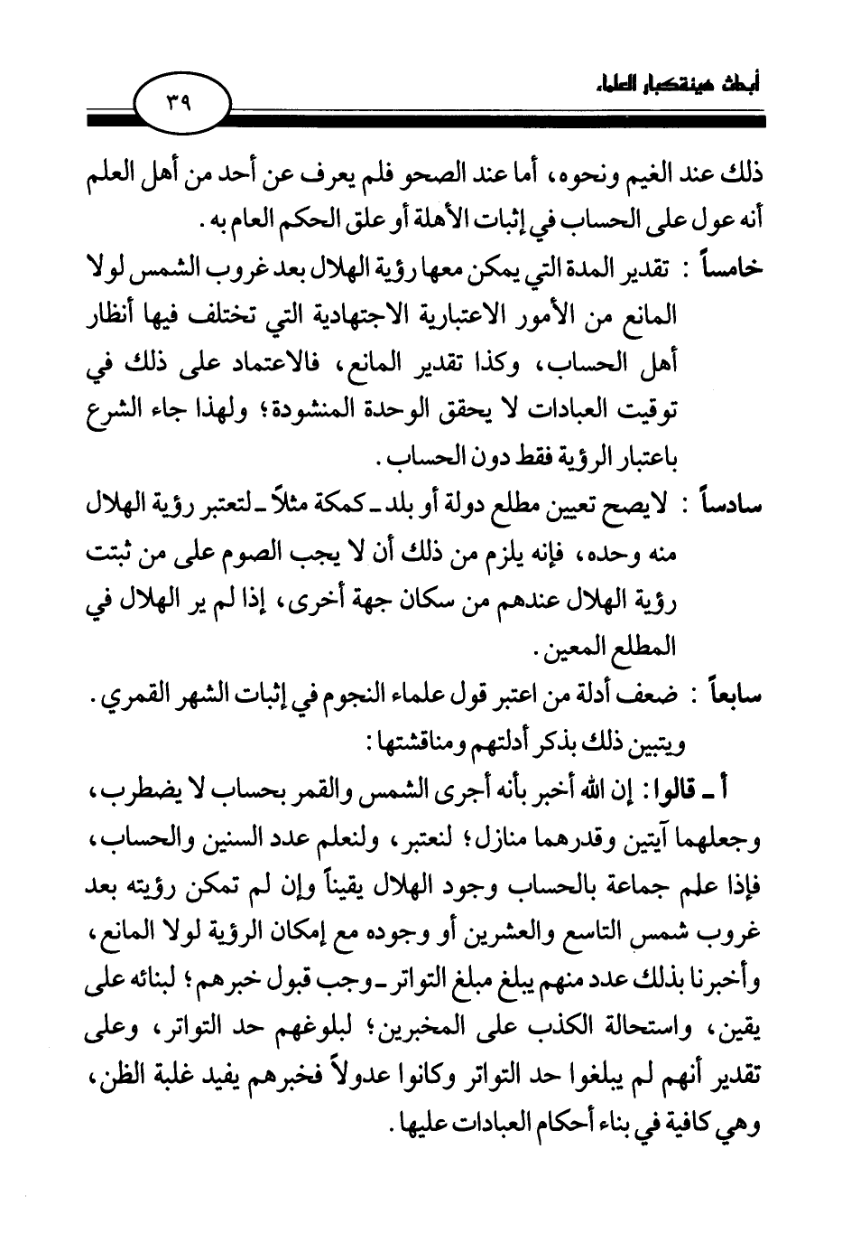 خامسا: تقدير المدة التي يمكن معها رؤية الهلال بعد غروب الشمس لولا المانع من الأمور الاعتبارية الاجتهادية التي تختلف فيها أنظار أهل الحساب، وكذا تقدير المانع، فالاعتماد على ذلك في توقيت العبادات لا يحقق الوحدة المنشودة؛ ولهذا جاء الشرع باعتبار الرؤية فقط دون الحساب.