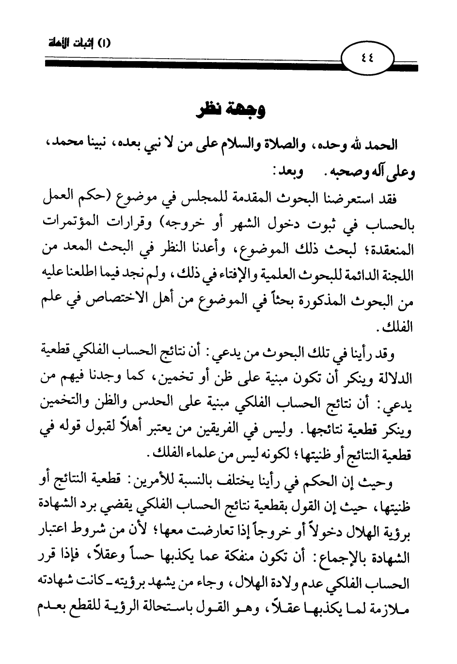 وقد رأينا في تلك البحوث من يدعي: أن نتائج الحساب الفلكي قطعية الدلالة وينكر أن تكون مبنية على ظن أو تخمين، كما وجدنا فيهم من يدعي: أن نتائج الحساب الفلكي مبنية على الحدس والظن والتخمين وينكر قطعية نتائجها. وليس في الفريقين من يعتبر أهلا لقبول قوله في قطعية النتائج أو ظنيتها؛ لكونه ليس من علماء الفلك.