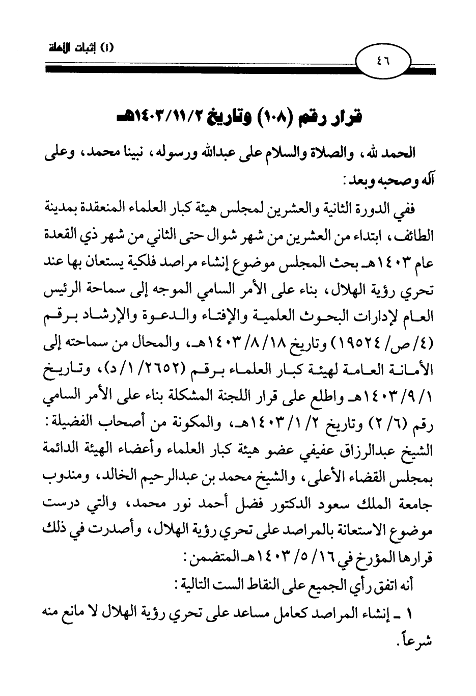 ففي الدورة الثانية والعشرين لمجلس هيئة كبار العلماء المنعقدة بمدينة الطائف، ابتداء من العشرين من شهر شوال حتى الثاني من شهر ذي القعدة عام 1403هـ بحث المجلس موضوع إنشاء مراصد فلكية يستعان بها عند تحري رؤية الهلال، بناء على الأمر السامي الموجه إلى سماحة الرئيس العام لإدارات البحوث العلمية والإفتاء والدعوة والإرشاد برقم (4\ص\19524) وتاريخ 18\8\1403هـ، والمحال من سماحته إلى الأمانة العامة لهيئة كبار العلماء برقم (2652\1\د) ، وتاريخ 1\9\1403هـ واطلع على قرار اللجنة المشكلة بناء على الأمر السامي رقم (6\2) وتاريخ 2\1\1403هـ، والمكونة من أصحاب الفضيلة الشيخ عبد الرزاق عفيفي عضو هيئة كبار العلماء وأعضاء الهيئة الدائمة بمجلس القضاء الأعلى، والشيخ محمد بن عبد الرحيم الخالد، ومندوب جامعة الملك سعود الدكتور فضل أحمد نور محمد، والتي درست موضوع الاستعانة بالمراصد على تحري رؤية الهلال، وأصدرت في ذلك قرارها المؤرخ في 16\5\1403هـ المتضمن: