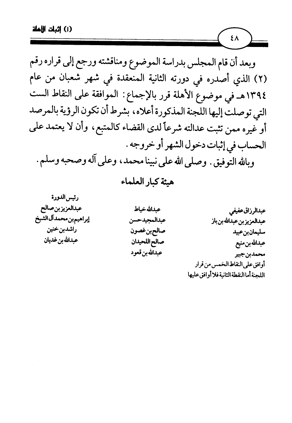 وبعد أن قام المجلس بدراسة الموضوع ومناقشته ورجع إلى قراره رقم (2) الذي أصدره في دورته الثانية المنعقدة في شهر شعبان من عام 1394هـ في موضوع الأهلة قرر بالإجماع: الموافقة على النقاط الست التي توصلت إليها اللجنة المذكورة أعلاه، بشرط أن تكون الرؤية بالمرصد أو غيره ممن تثبت عدالته شرعا لدى القضاء كالمتبع، وأن لا يعتمد على الحساب في إثبات دخول الشهر أو خروجه.