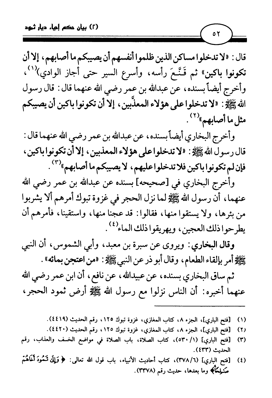 قال: لا تدخلوا مساكن الذين ظلموا أنفسهم أن يصيبكم ما أصابهم إلا أن تكونوا باكين ثم قنع رأسه، وأسرع السير حتى أجاز الوادي (¬1) » وأخرج أيضا بسنده، عن عبد الله بن عمر رضي الله عنهما قال: قال رسول الله صلى الله عليه وسلم: «لا تدخلوا على هؤلاء المعذبين، إلا أن تكونوا باكين أن يصيبكم مثلما أصابهم (¬2) » .